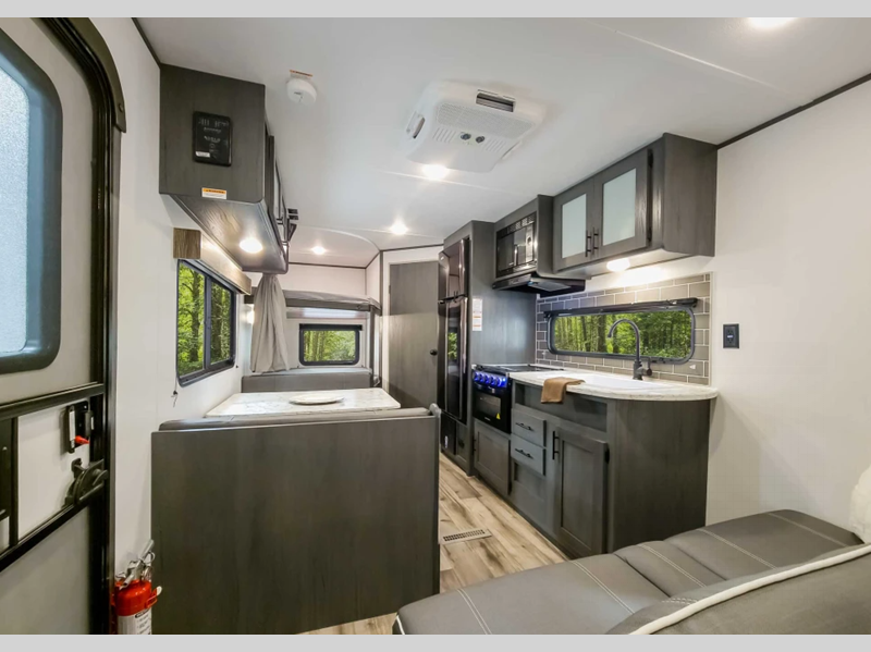 Sleeps 8 Slides 1 Length 31 ft Ext Height 11 ft 1 in Int Height 6 ft 10 in Interior Color Titanium, Tungsten Hitch Weight 836 lbs Dry Weight 6099 lbs Cargo Capacity 1501 lbs Fresh Water Capacity 45 gals Grey Water Capacity 42 gals Black Water Capacity 42 gals Number Of Bunks 2 Available Beds Queen Refrigerator Type 12V Refrigerator Size 10 cu ft Cooktop Burners 3 Number of Awnings 1 LP Tank Capacity 20 lbs Water Heater Type On Demand Tankless AC BTU 13500 btu Awning Info 16' Power w/LED Light Axle Count 2 Number of LP Tanks 2 Shower Type Standard Electrical Service 30 amp Similar Floorplans