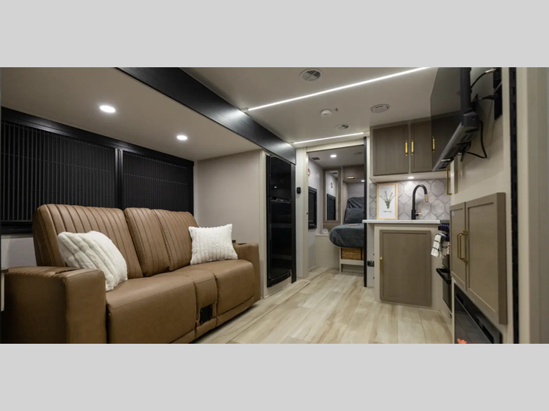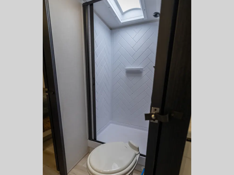 Each model is built with laminated "Aluma Frame" sidewalls and floor with block foam insulation for added durability. There is a power tongue jack with an LED docking light, along with an outside shower, and an extra large pass-thru storage for camp gear. You'll also enjoy the included Elevated Value Package that features conveniences such as square windows with built-in shades, 60K BTU On-Demand tankless water heater, and Maxxis radial tires.