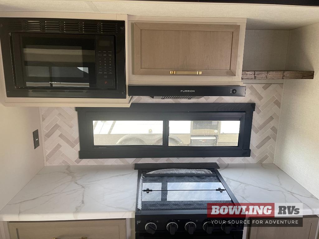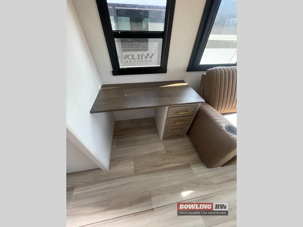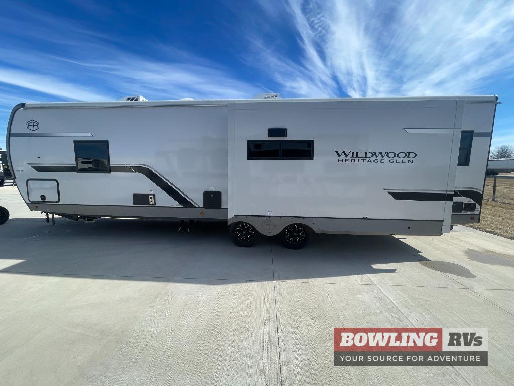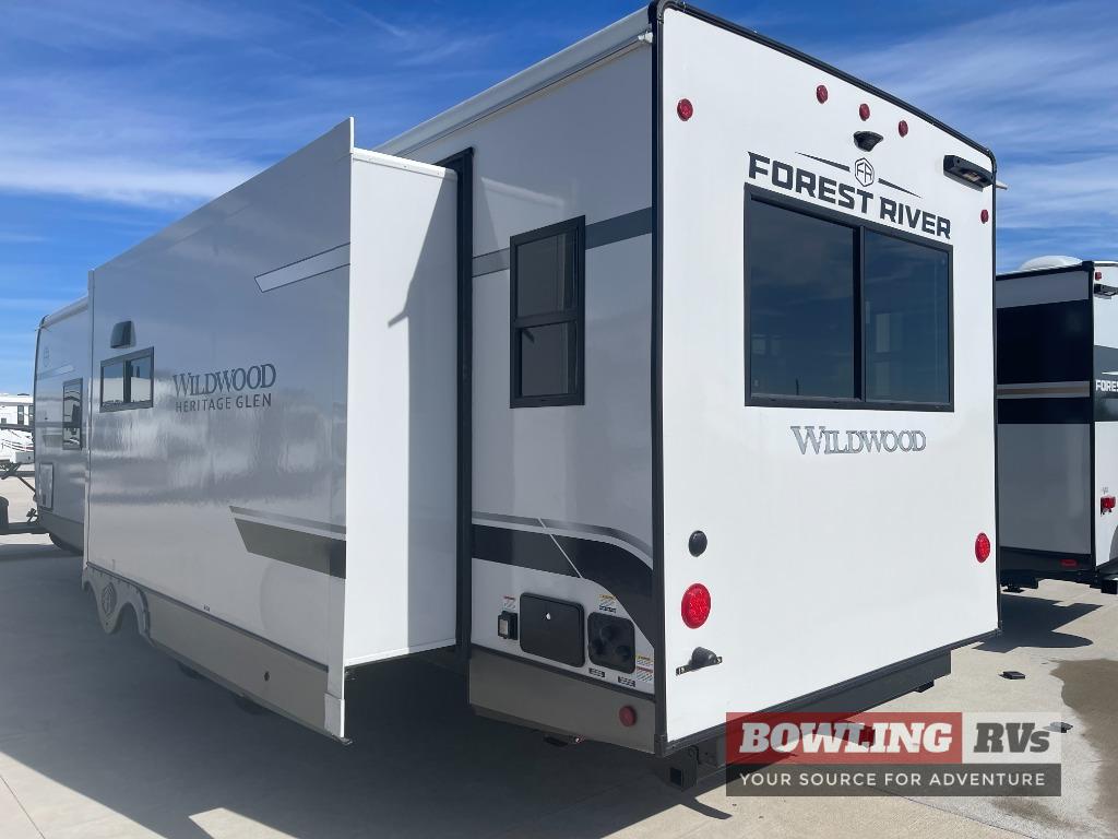 With any Wildwood Heritage Glen travel trailer by Forest River, the quality construction, attention to detail and design along with a bright and welcoming interior allows you to relax in comfort. Each model includes a WeatherShield one piece fiberglass roof, nitrogen-filled radial tires, and an enclosed underbelly with 12V tank heaters on all holding tanks for added protection. You will appreciate the on-demand tankless water heater, along with power stabilizer and tongue jacks, and an extra-large pass-thru storage with slam latch baggage doors. Head inside to enjoy matte gold hardware, wood door casings in place of plastic door casings, and an ultimate interior lighting upgrade with 4k puck/strip lights and a stylish LED back-lit bath mirror!