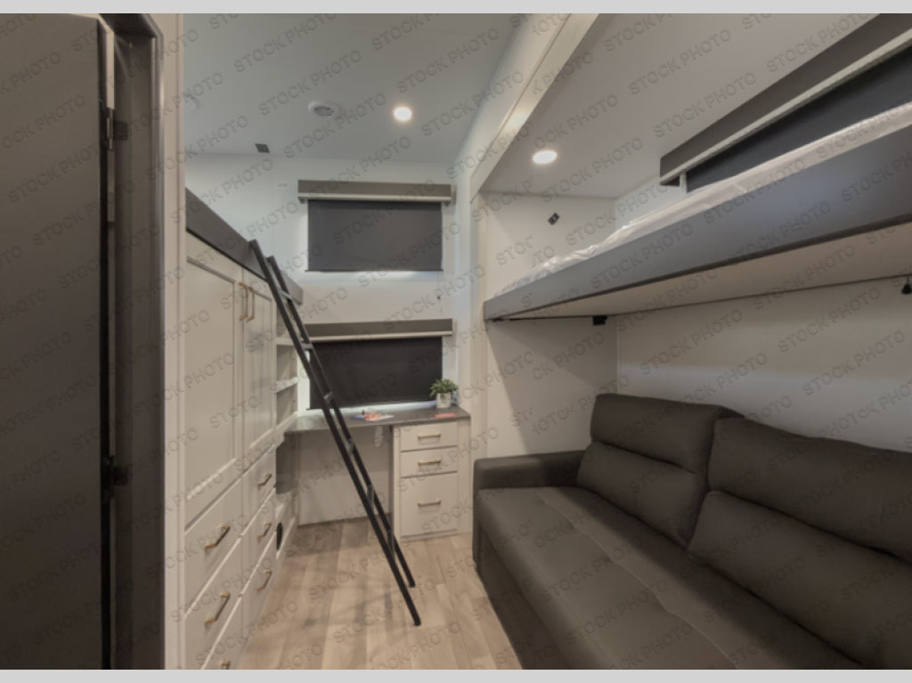Your whole crew will love camping in this spacious fifth wheel! There is a rear private bunkhouse with a tri-fold sofa and fold-down bunk within a slide, plus a second bunk, storage space, and even a half bath with one of the dual entry doors to the unit for added convenience! You'll find your own space in the front private bedroom, complete with a queen bed slide out, a pass-thru clothes hamper that goes directly into the full bath, plus washer and dryer prep if you choose to add these appliances. A U-shaped kitchen includes ample counter space, a spice rack above the microwave, plus a flip-up countertop extension for even more prep space. There is also a U-shaped dinette where you can all dine around, plus an L-shaped sofa with recline at the end for relaxing space. And you're sure to appreciate the entertainment wall with an LED smart TV, fireplace and smart storage!