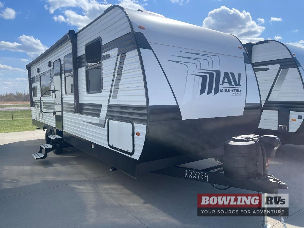 You will love this Momentum MAV toy hauler travel trailer! The front bedroom features a queen bed, and there is plenty of room to walk around. The sliding solid bedroom door helps with space. Overhead storage and a pair of nightstands are convenient storage, plus there is a wardrobe with both drawers and space to hang items. The kitchen offers a microwave, stainless steel sink, and an 8 cu. ft. 12V refrigerator. In the garage, you'll find rollover sofas with a table and a top bed for guests to sleep on. The ramp door/patio will provide additional living space once your toys are unloaded, and the pull down screen will keep bugs out!