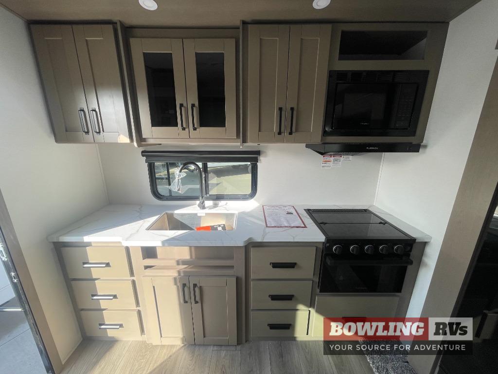 This rear kitchen fifth wheel is sure to meet all of your camping needs! Since the exterior length is only 26' 11", you can easily maneuver in and out of campgrounds. The rear kitchen includes ample counter space to prep meals, a three burner cooktop, and overhead storage for all your necessities. There is a 10 cu. ft. 12V refrigerator within the slide out that also includes the theater seating, and the U-shaped dinette provides a place to dine or play a card game. You will appreciate having convenient storage by the entry door, along with pull-out pet bowls, a functional wardrobe closet in the bedroom and an exterior pass-thru for belongings and camping gear. When you're ready to turn in for the night, the queen bed is sure to bring a great night's rest, while your guests sleep on the booth dinette or optional tri-fold sofa if you replace the theater seating!