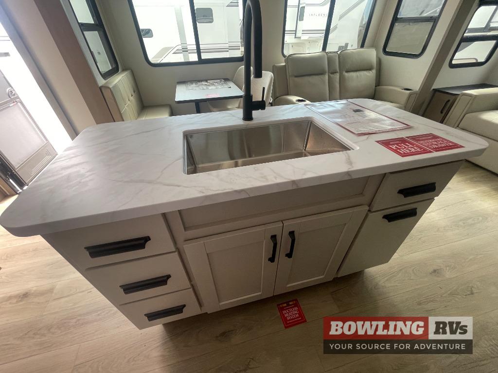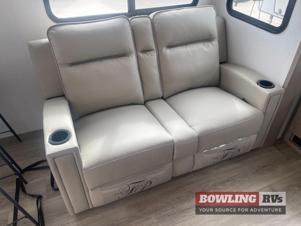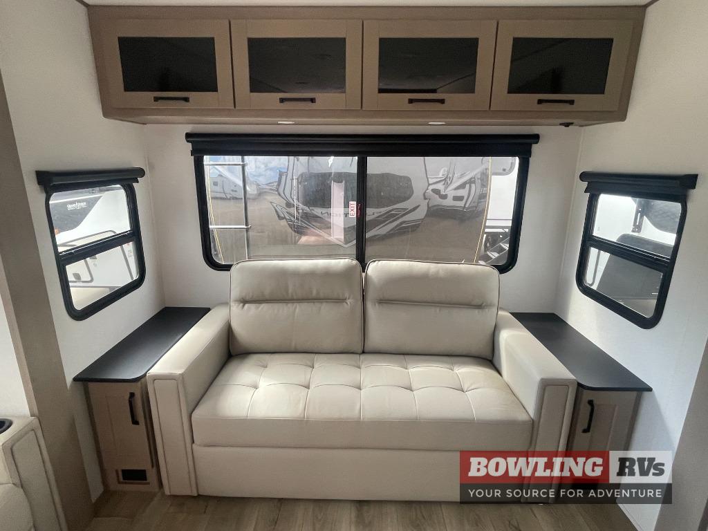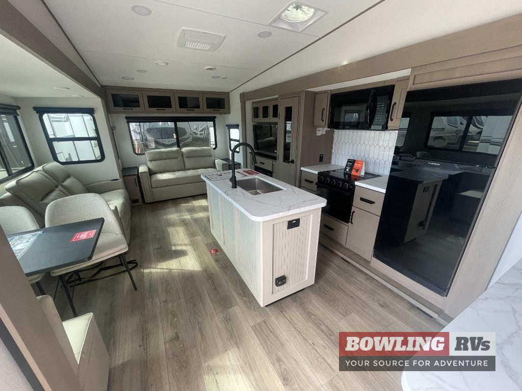 Get ready to enjoy everything the campgrounds and surrounding area has to offer when you are setup to camp in this fifth wheel! The two electric awnings offer protected areas creating outdoor living spaces; just grab your camping chairs from the unobstructed pass-through storage. And the interior offers a spacious living area and kitchen combination with dual opposing slides for maximum space. You can sit on the tri-fold sofa or the booth dinette with an option for a swivel dinette. The hutch and kitchen island offer counter space to prepare and serve meals, and there is a large pantry for goodies. The 40" LED HDTV with a fireplace below provides entertainment before bedtime or on a rainy day. And the front bedroom offers privacy, a walk-around queen bed, and plenty of storage!