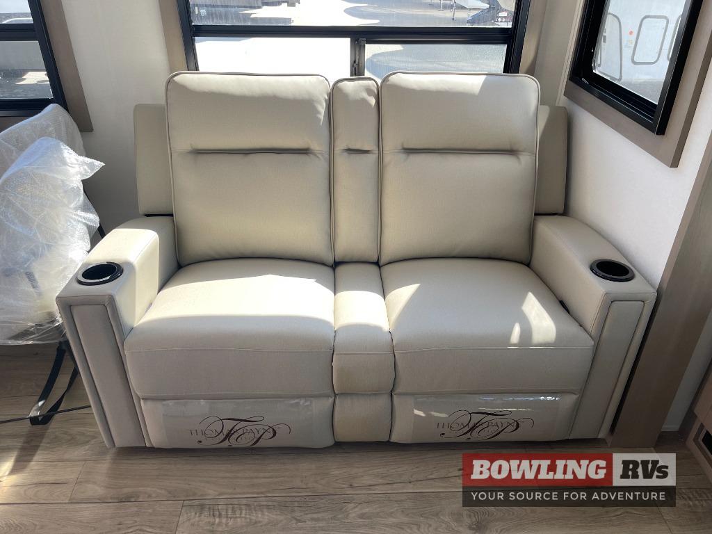 You can enjoy a spacious rear living area in this RV with dual opposing slides offering you entertainment, kitchen amenities, seating and windows for great views! The rear tri-fold sofa also converts into extra sleeping space for an extra guest or two, just like the booth dinette does. Yet you might like to add the swivel dinette option. There are theater seats to enjoy while you place your drinks in the cupholders and watch the entertainment center with a 40" LED HDTV and fireplace. The pantry is big enough to store your favorite snacks, and the kitchen island will make meal prepping easier, plus there is a 16-cu. ft. refrigerator to store any leftovers. The full bathroom has a 30" x 48" fiberglass shower and a linen closet to store your towels. The front private bedroom has a comfortable queen bed slide that can be switched out for the optional king bed, a dresser with overhead cabinets, and a full wall wardrobe that is prepped to add the optional washer!