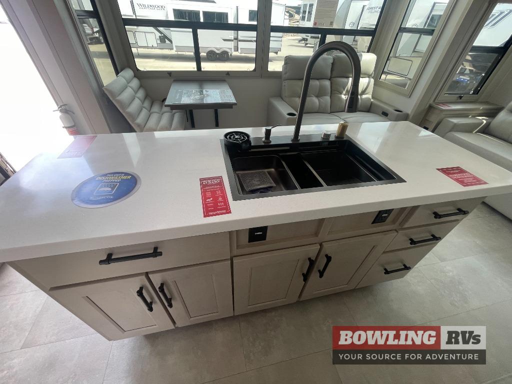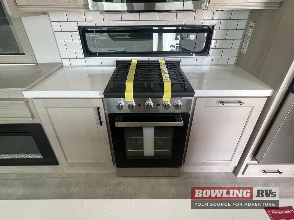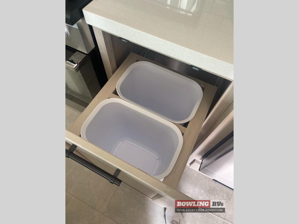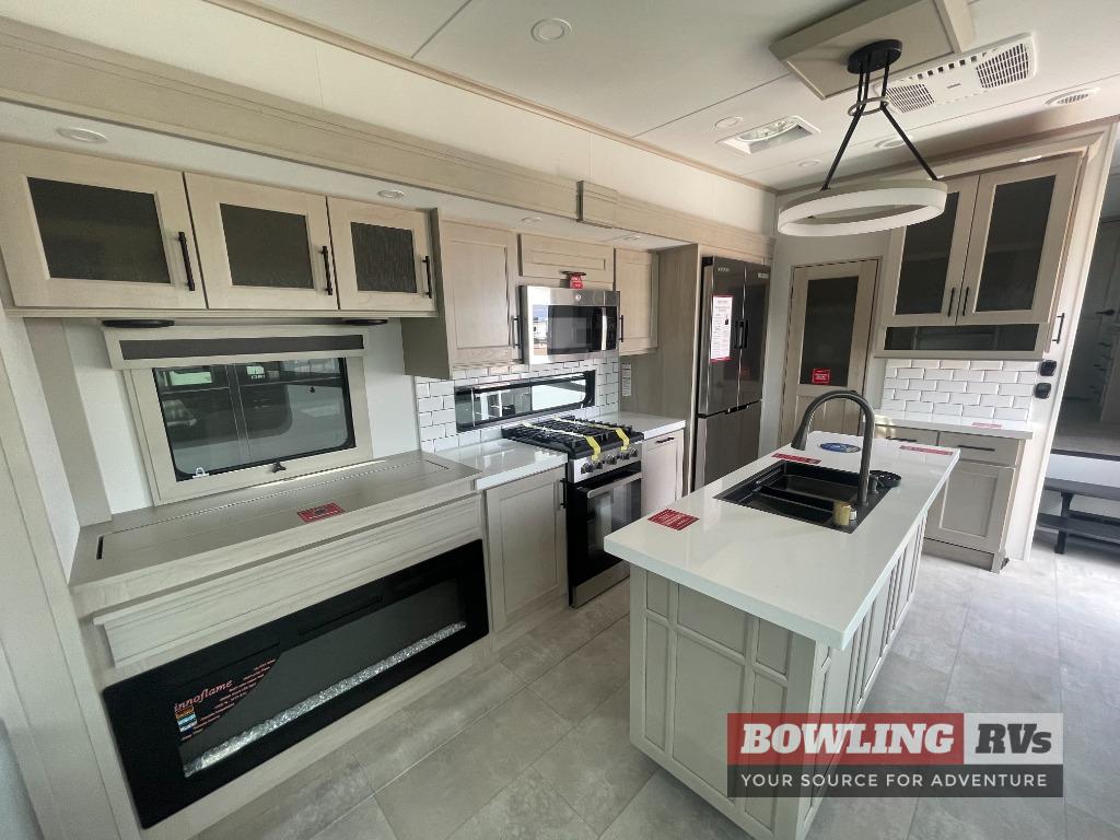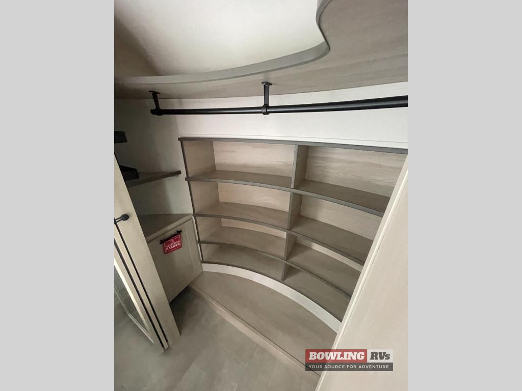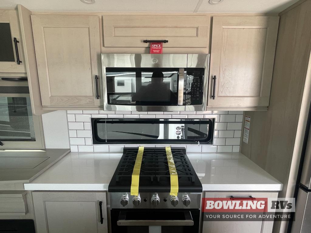 Traveling for long periods at a time is made easy with this gourmet kitchen that can feed your entire group a holiday meal! The professional-grade stainless steel cooktop with a built-in oven, microwave, 12V 20 cu. ft. refrigerator, and a kitchen island offers everything you will need to enjoy cooking for your family and guests. There is abundant storage throughout multiple overhead cabinets, a kitchen pantry and hutch, a bath linen cabinet for your towels, and in the front master bedroom which features a large closet. In the bedroom there is also a queen bed slide for added space to sleep comfortable at night, or you may choose an optional king bed if you enjoy more space. You will also find a closet with washer/dryer prep, large wardrobe, a clothes hamper plus a slide top dresser. Two nice awnings will provide outdoor living space keeping you protected from the sun and rain, and you can add an optional pull-out kitchen to enjoy convenient cooking outdoors as well.