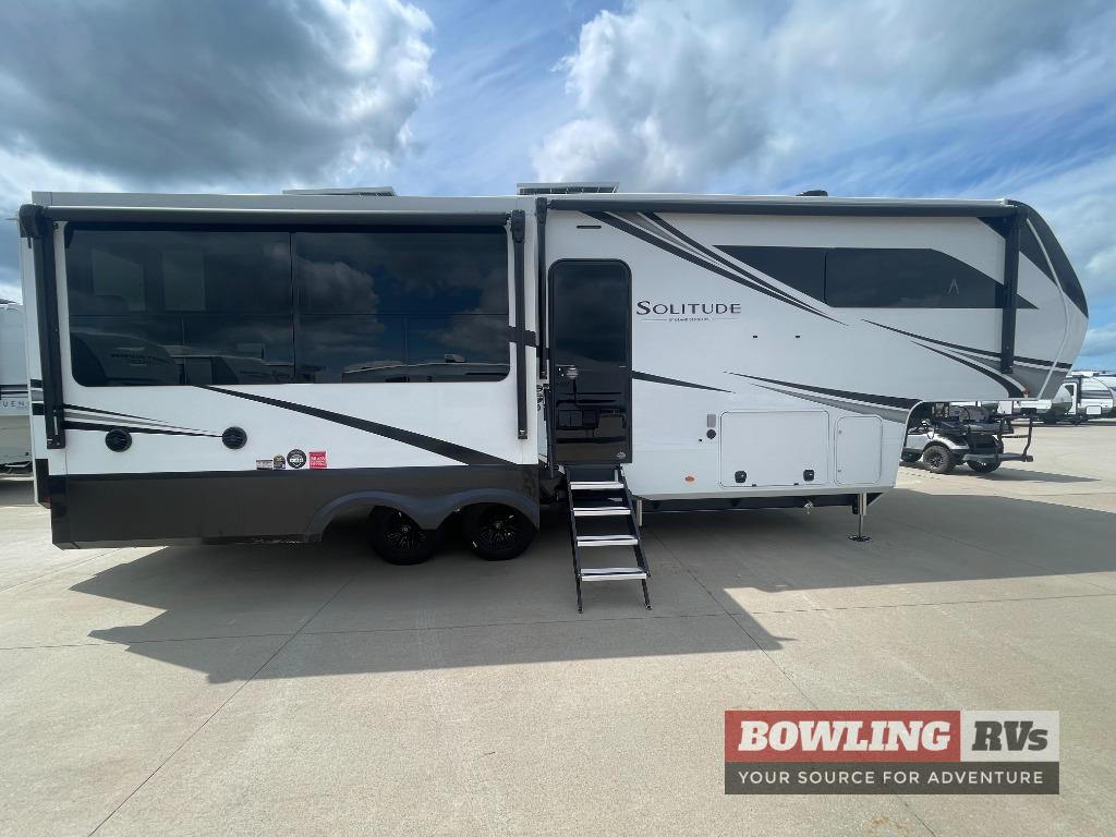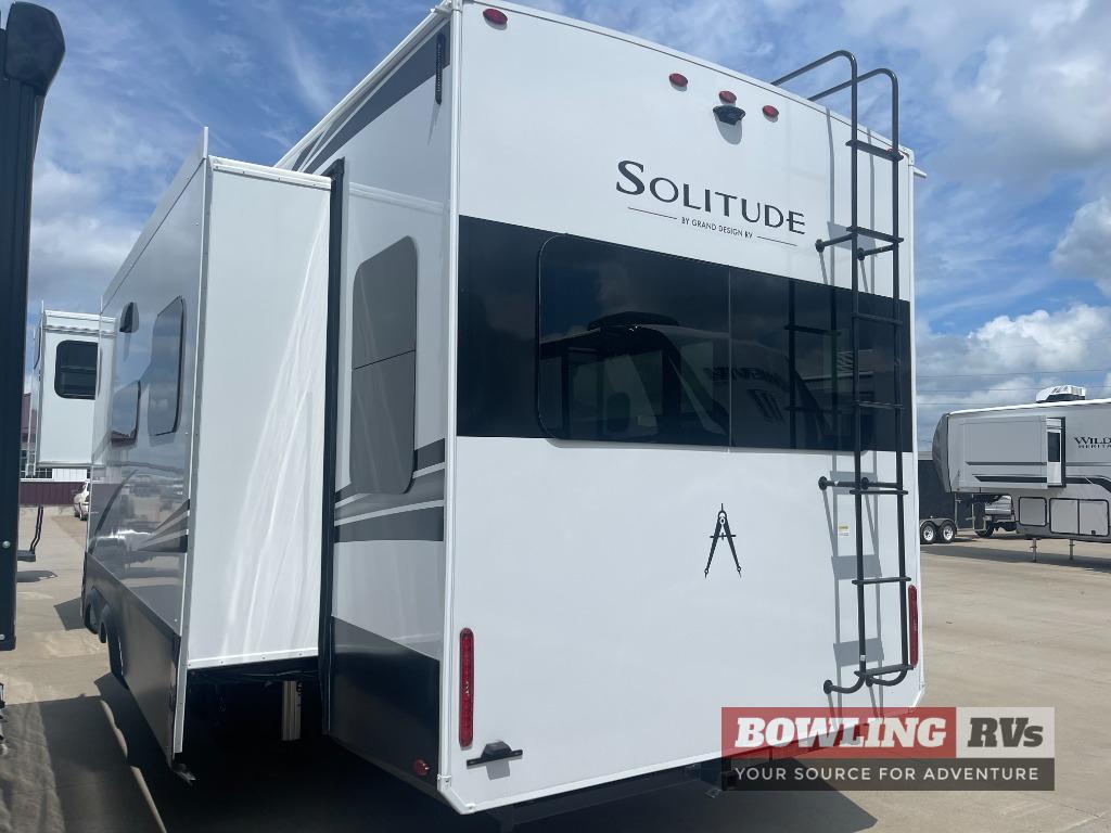 Each Solitude fifth wheel by Grand Design features a 101" wide-body construction, heavy duty 8,000 lb. axles, frameless tinted windows, and high-gloss gel coat sidewalls. You can camp year around thanks to the Weather-Tek Package that includes a 35K BTU high-capacity furnace, an all-in-one enclosed and heated utility center, and a fully enclosed underbelly with heated tanks and storage. Inside, you'll love the premium roller shades, hardwood cabinet doors, solid surface countertops, plus residential finishes throughout to make you truly feel at home. Each model also includes a MORryde CRE3000 suspension system, self adjusting brakes, and a MORryde pin box that will provide smooth towing from home to campground. Affordable luxury is possible with the Solitude fifth wheels; choose yours today!
