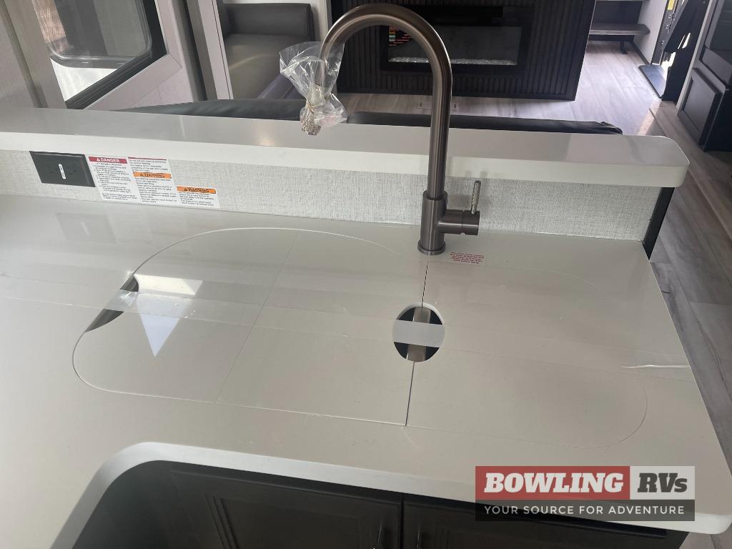 The whole gang will love camping in this fifth wheel since there is space for everyone! A front master bedroom includes a king bed slide out, master closet, and stackable washer and dryer prep if you choose to go full-time. Your guests or little ones will love the middle bunkhouse with a flip bunk above a hide-a-bed sofa, along with a pull-out table and storage space. Everyone can meet in the living area which features dual opposing slides for more space, theater seating, a sleeper sofa, and a U-shaped dinette, providing even more sleeping space. And check out the rear kitchen with its wrap-around counter space, Furrion appliances, and large pantry to keep snacks stocked!