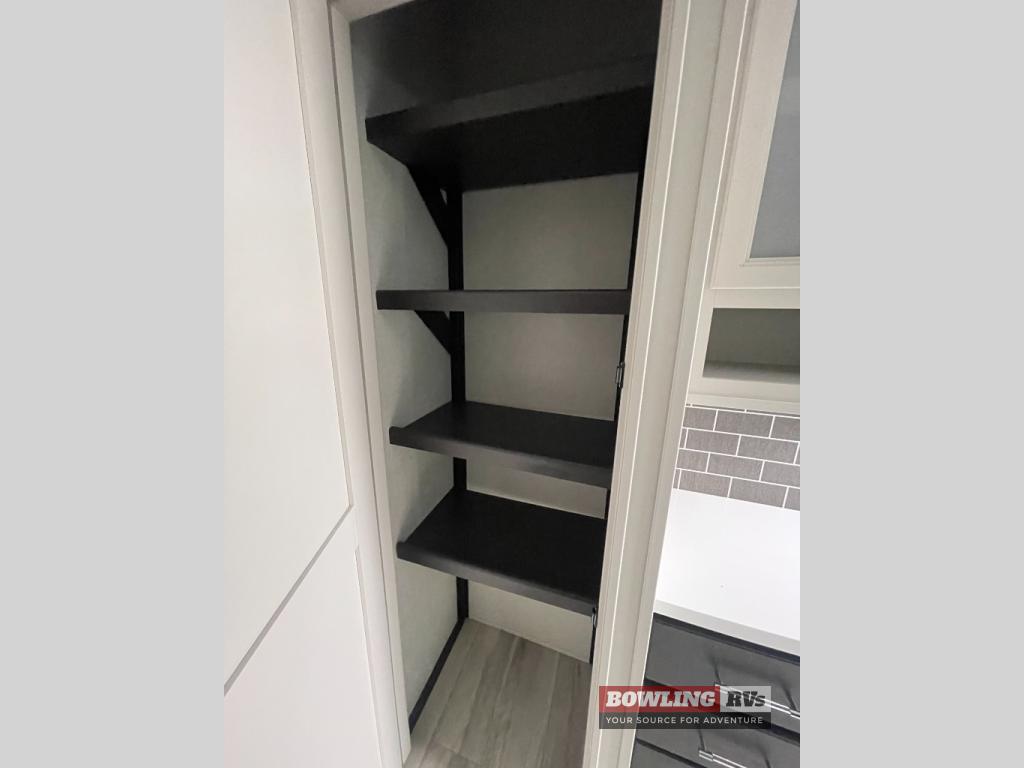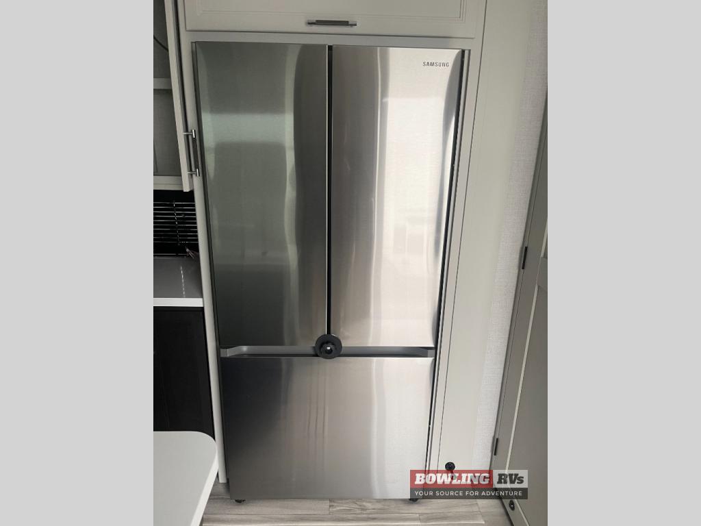 It will be so easy to enjoy trips in this spacious fifth wheel that can sleep six each night! The rear living room features L-shaped sofa slide outs with ottomans, a 65" TV with a large feature wall, and a fireplace to make it cozier. There is a stylish lighted beam and lighted steps that lead to the middle kitchen with dual opposing slides, a kitchen island, triple pantries, and a free-standing dinette. And the chef will appreciate all the kitchen appliances to make their best meals for the whole gang. As you head up the steps, you'll find a full bath to easily freshen up each day, and you'll love the front private bedroom with a king bed slide, master closet with hidden shoe storage, plus stackable washer and dryer prep!