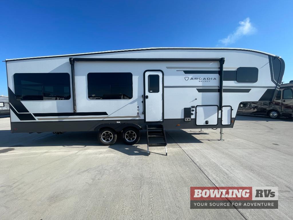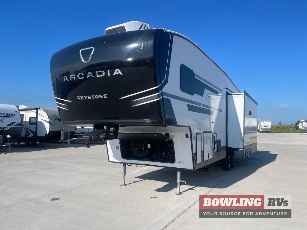 With any Arcadia Select fifth wheel by Keystone you will enjoy easy towability and at-home comforts at an affordable price! The laminated sidewalls with five sided aluminum superstructure will provide a strong foundation so you can enjoy your RV for years to come, plus a one-piece, heated and enclosed polypropylene underbelly means you can camp year around! And an upgraded Roto-Flex hitch pin will make it easy to tow. Head inside to find tall slides for added space, seamless, pressed countertops, convenient underbed storage, and a large shower with a retractable door and skylight. These fifth wheels also include a Blade Pure A/C system, Girard on-demand tankless water heater, two 30 lb. LP tanks, and more utilities to make your camping experience run smoothly.