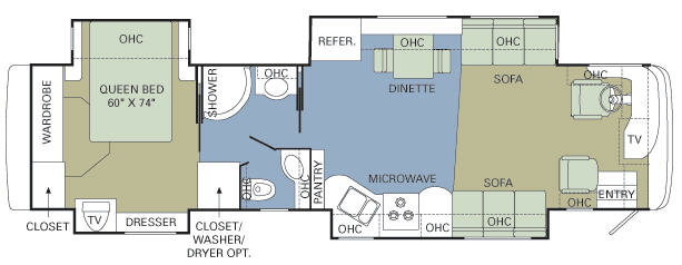 Quad Slide, Rear Wardrobe, Closet, Queen Bed, Stool Room w/Lav., Angle Shower, Lav., Pantry, Refrigerator, Double Kitchen Sink, 3 Burner Range, Microwave, Free Standing Dinette w/Chairs, 2 Sofas, TV Above Cab Area, Overhead Cabinets and More.
