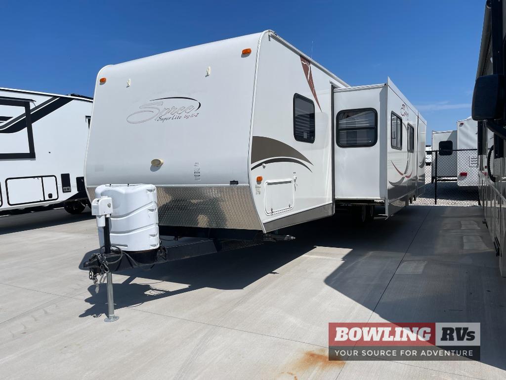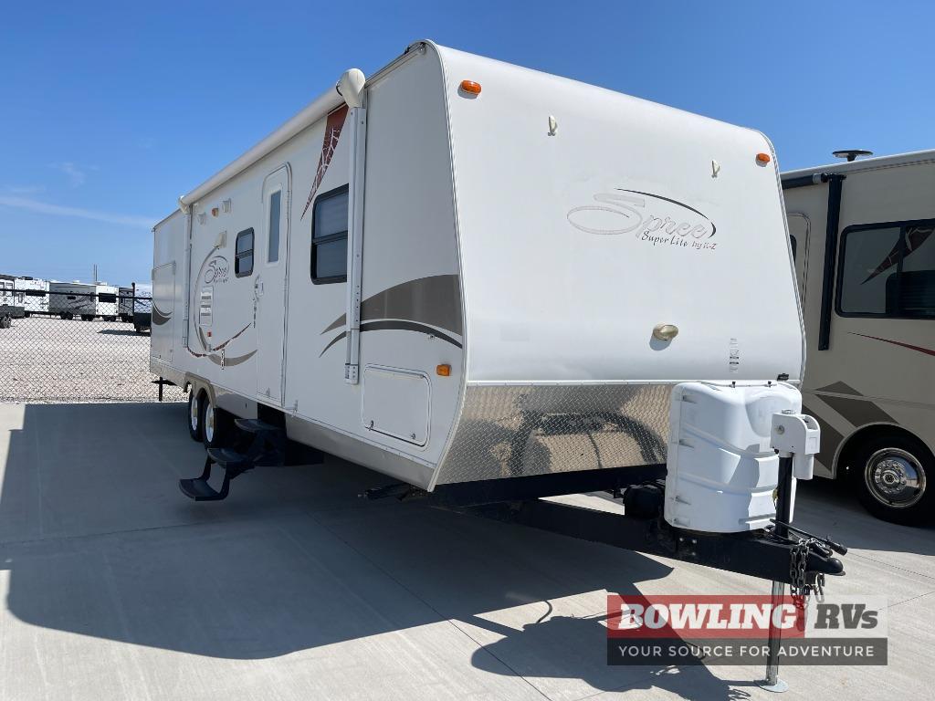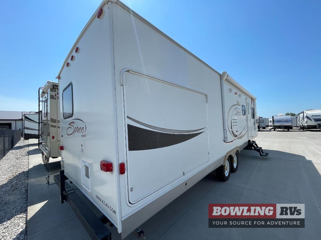 Double Slide Spree Travel Trailer, Rear Slideout Triple Bunks Includes Trundle Bed, Closet, Rear Exterior Kitchen w/Single Galley Sink, Refrig., Bath w/Tub, Toilet, Lav. w/Med. Cab., U-Shaped Dinette/Sofa Slideout w/Overhead Cab., Refrig., 3 Burner Range, Dbl. Kitchen Sink, Overhead Cab., Ent. Ctr., Front Queen Bed w/Dbl. Ward., Pass Thru Storage and More.