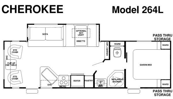 The Cherokee Cascade 264L travel trailer by Forest River offers a single slide and a rear living area.