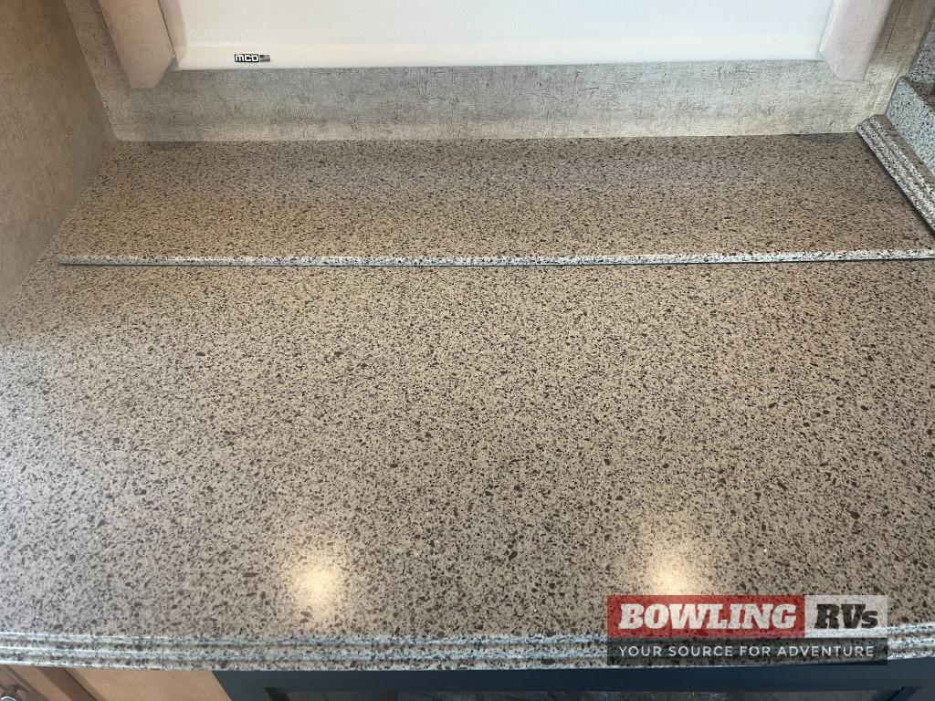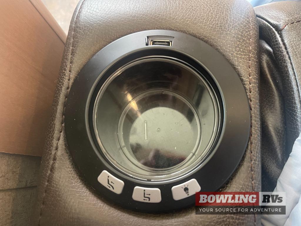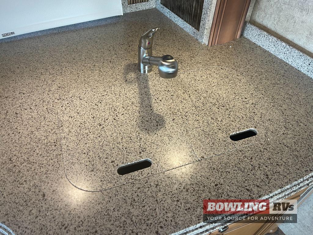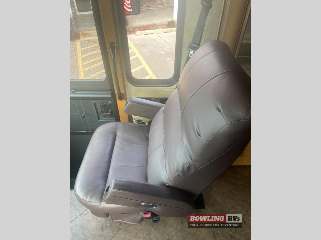 Both the driver and passenger seat easily swivel around to provide more seating in the living area. On the curb side of the motor home you will find a fireplace, LED TV on powerlift, three burner range, and large sink.