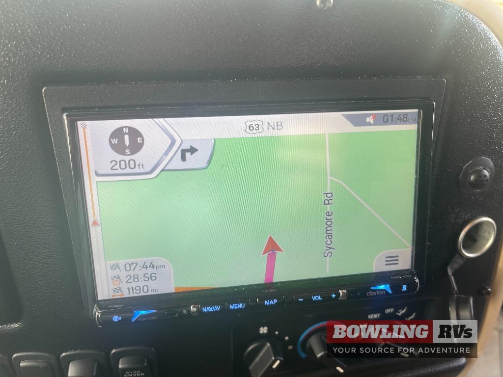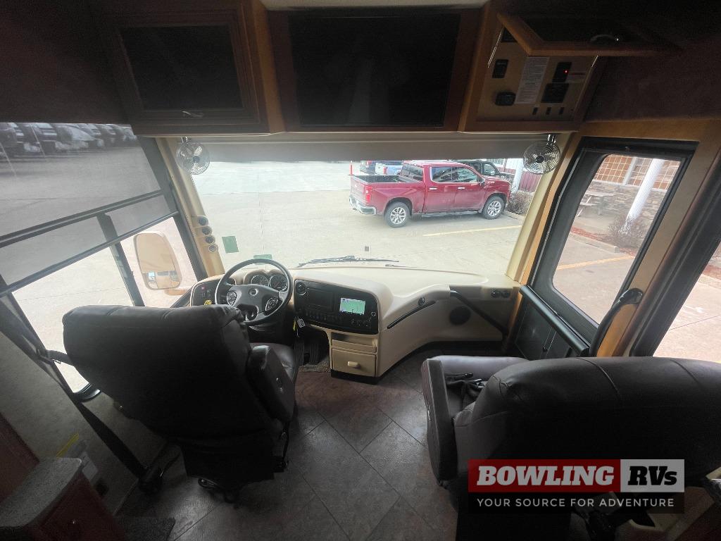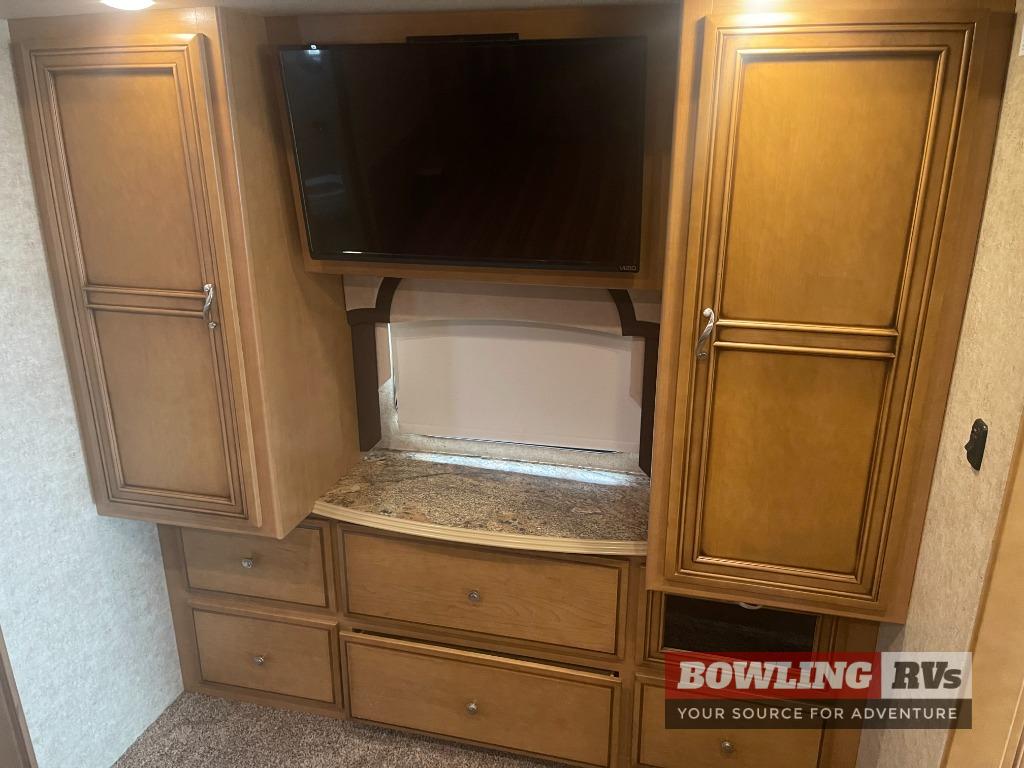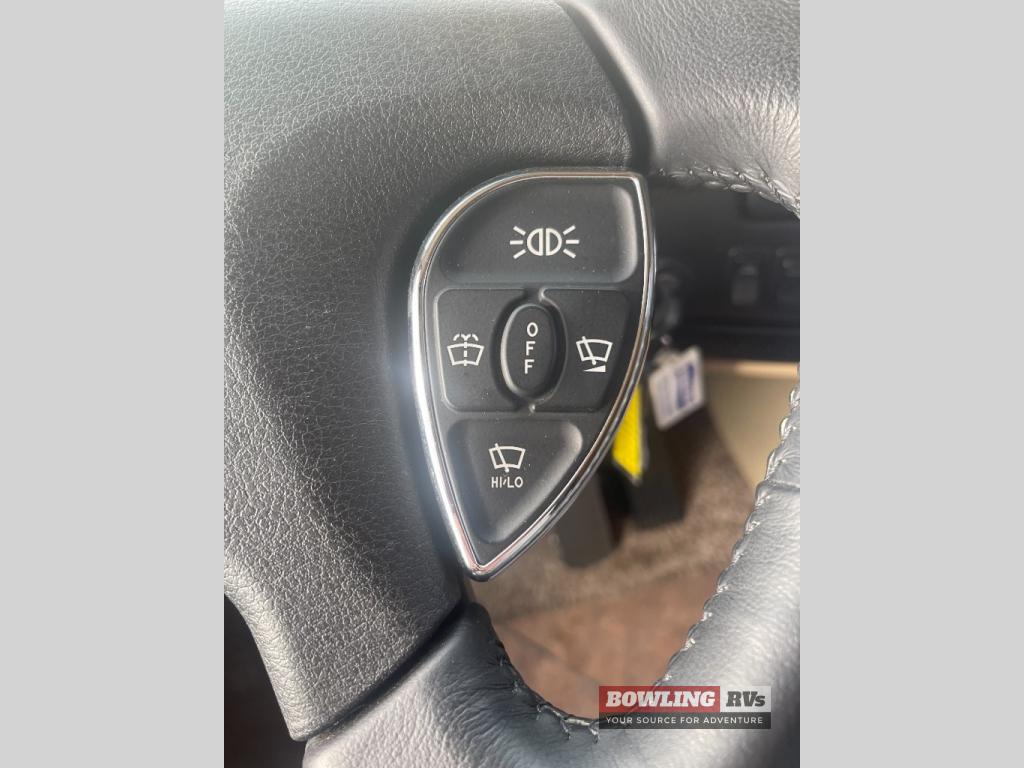 Both the driver and passenger seat easily swivel around to provide more seating in the living area. On the curb side of the motor home you will find a fireplace, LED TV on powerlift, three burner range, and large sink.