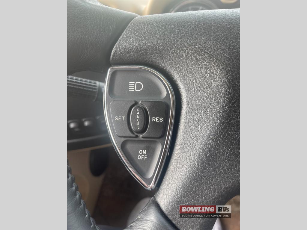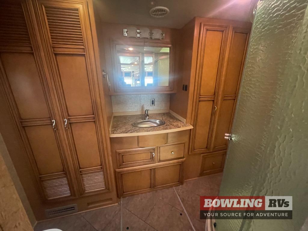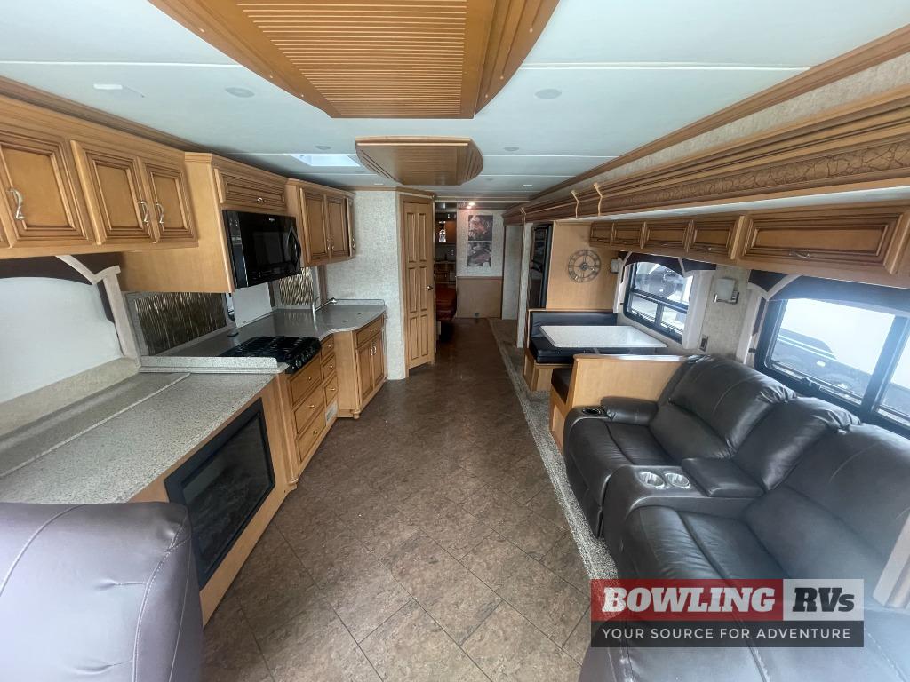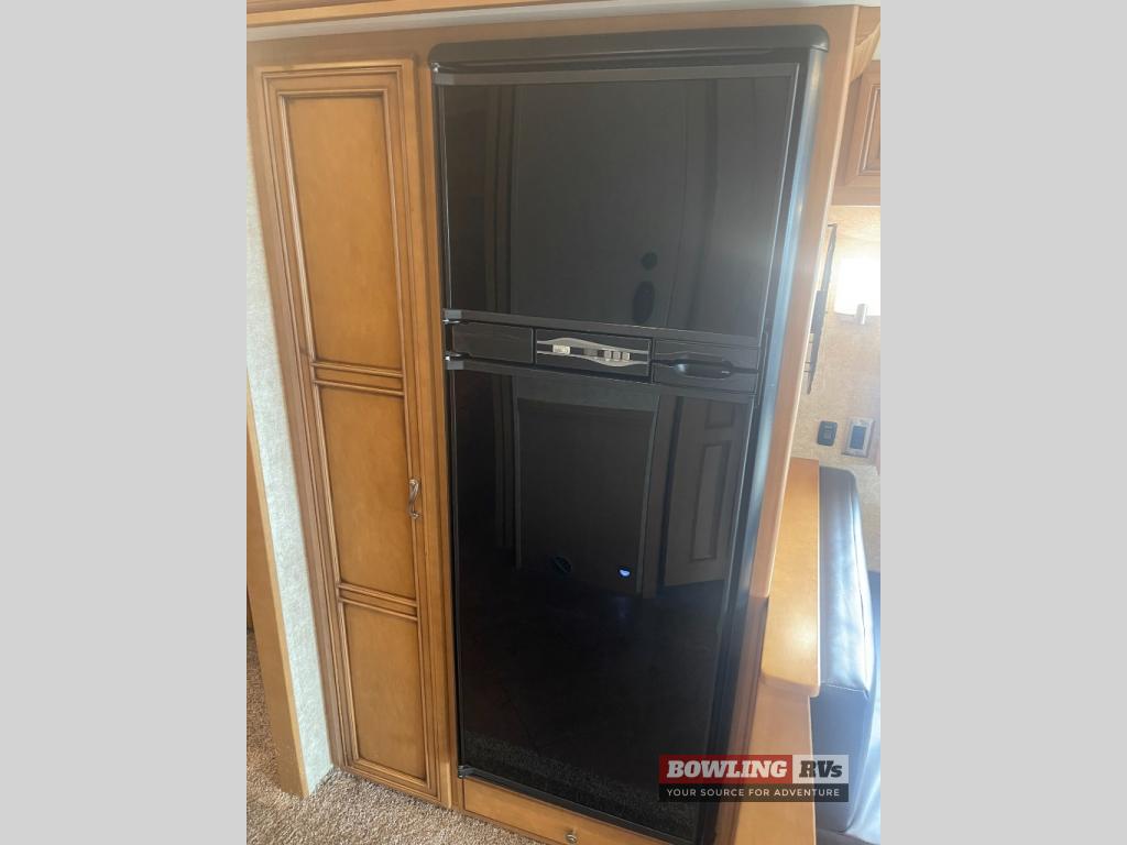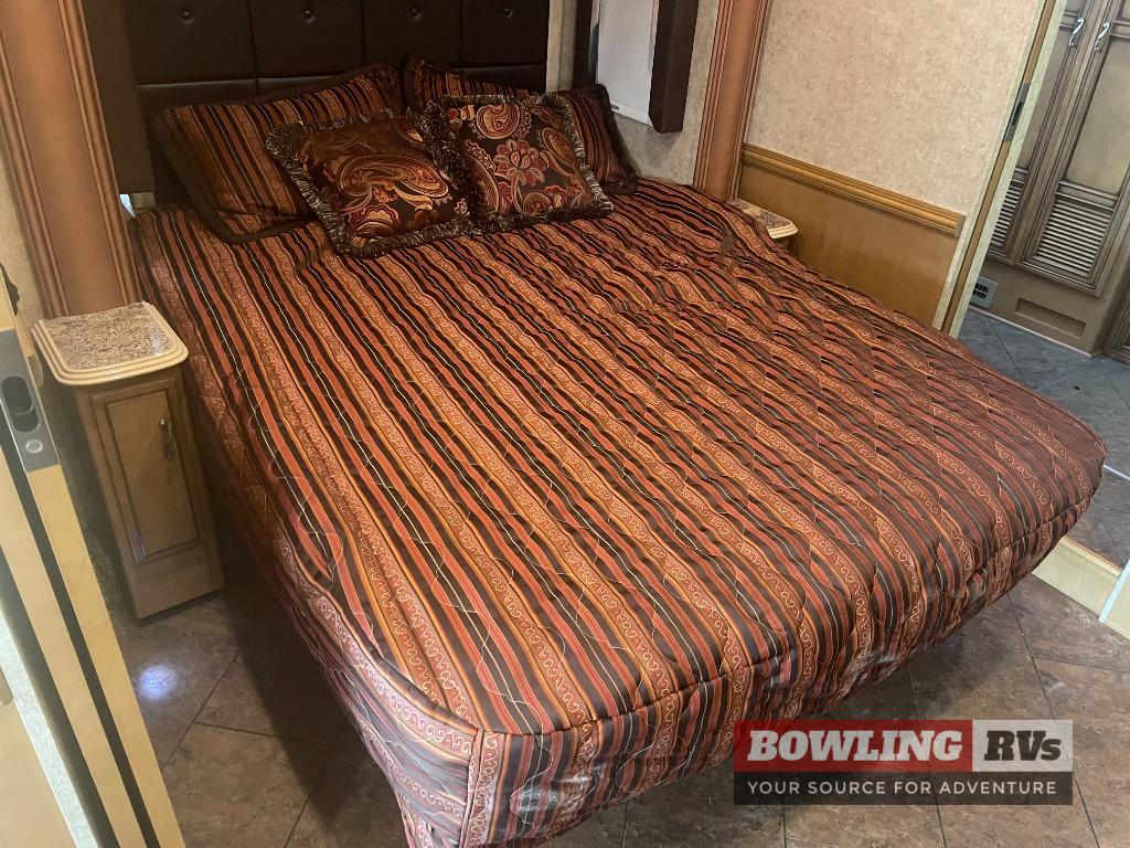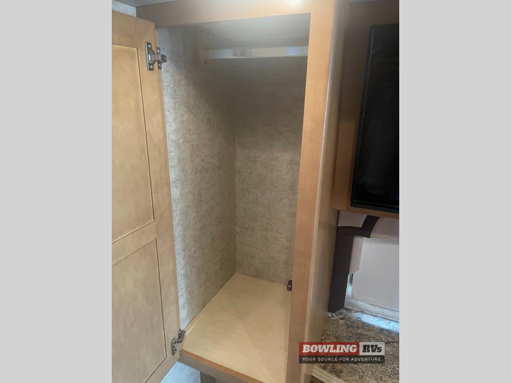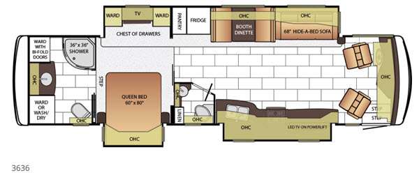 Along one side of the motor home there is a slide with a LED TV on a power lift, three burner range, and double kitchen sink. The opposite side of the motor home has a slide with a 68" hide-a-bed sofa, booth dinette, refrigerator, pantry, two wardrobes in the bedroom, a chest of drawers, and an overhead TV.