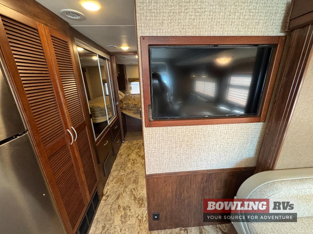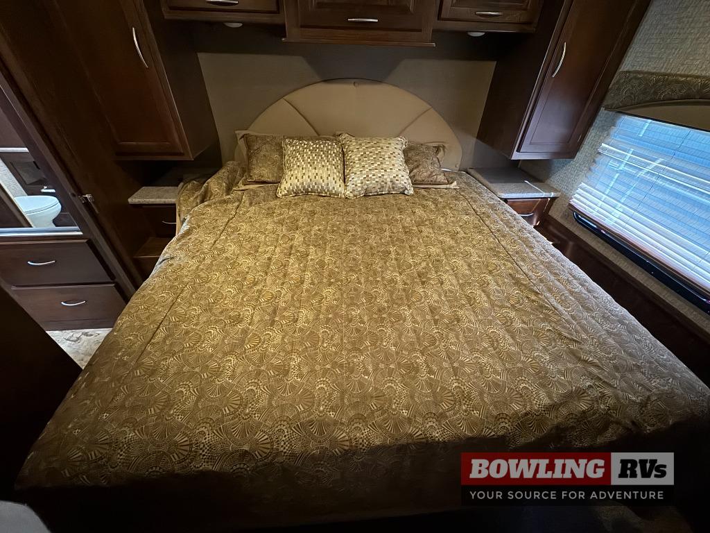 The very rear of this unit features a king size bed for comfortable sleeping, overhead storage, and bedside storage as well. Opposite the bed find a slide out with wardrobe space on either side of a flat screen TV including drawers, plus so much more!