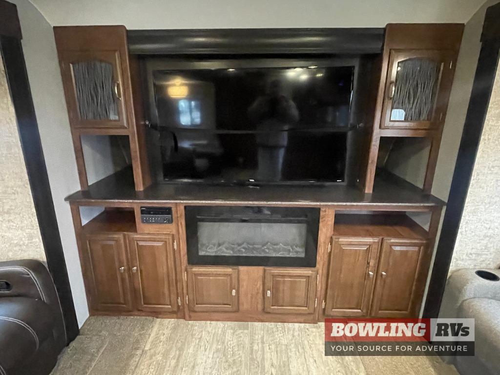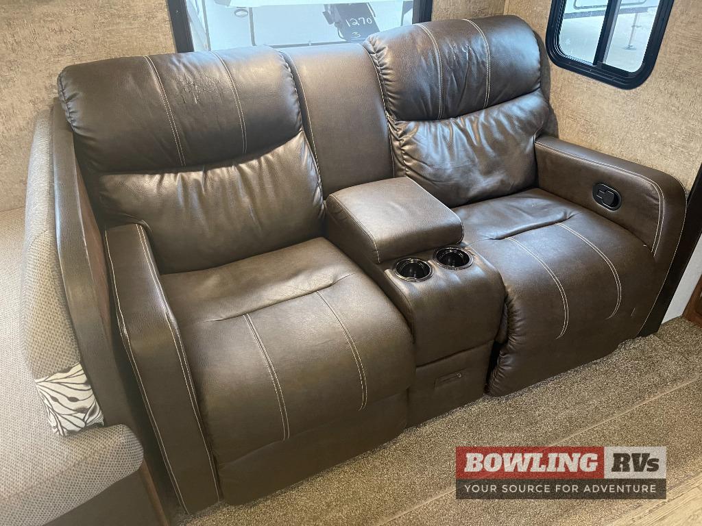 Next, head inside through the door furthest to the front where you will find a spacious living area including a full wall entertainment center and cozy fireplace. There is a slide out hide-a-bed sofa with overhead storage to your immediate right through the door. Opposite enjoy more seating with a slide out theater seat for two, and a booth dinette for meal time or just hanging out. The theater seats also offer storage above for your things.