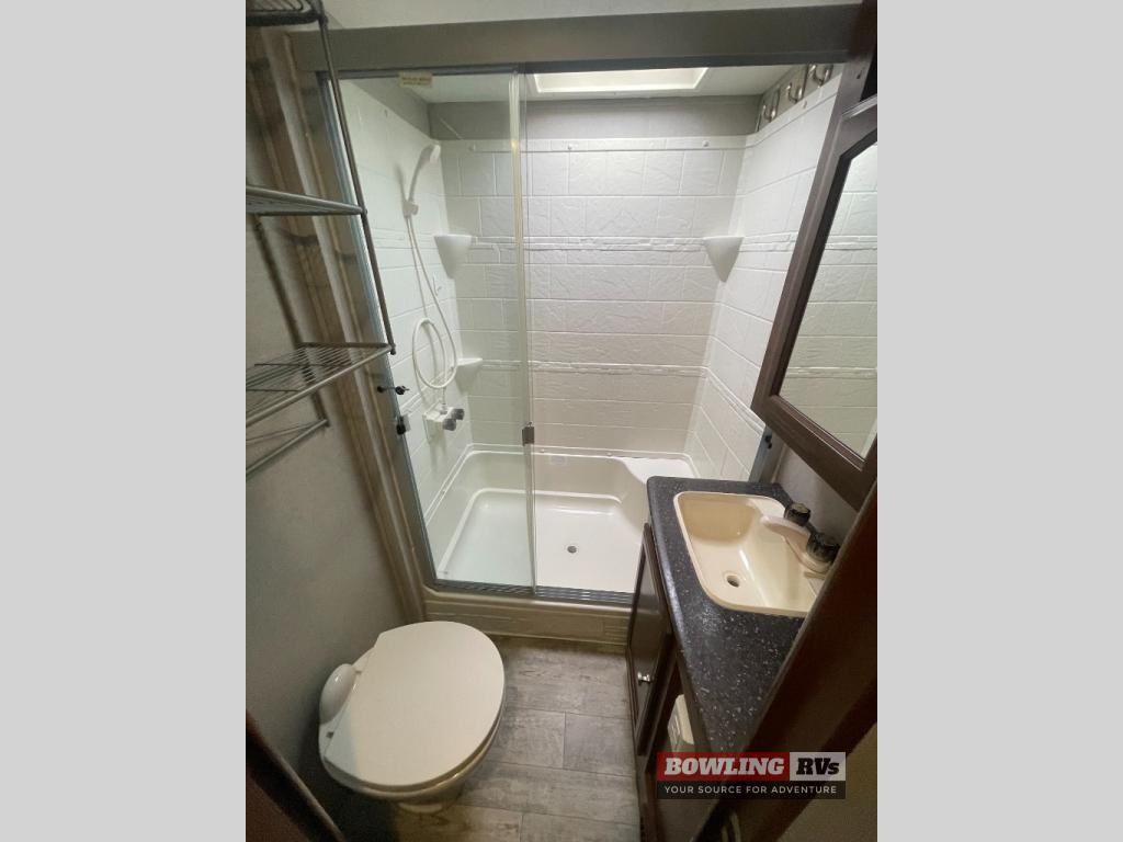 Continue on toward the back of this unit and find a side aisle bath on your right side. Here you can enjoy a convenient shower, toilet, and vanity with sink, plus overhead cabinet. There is also a storage hutch opposite the bath along the curb side wall.