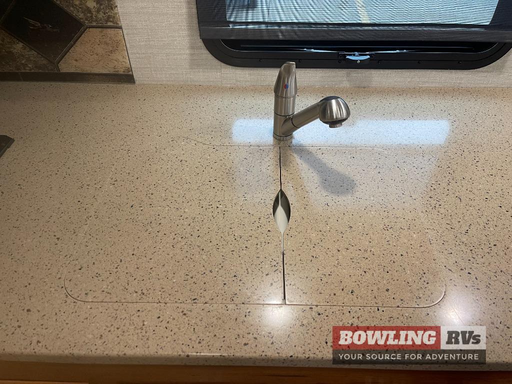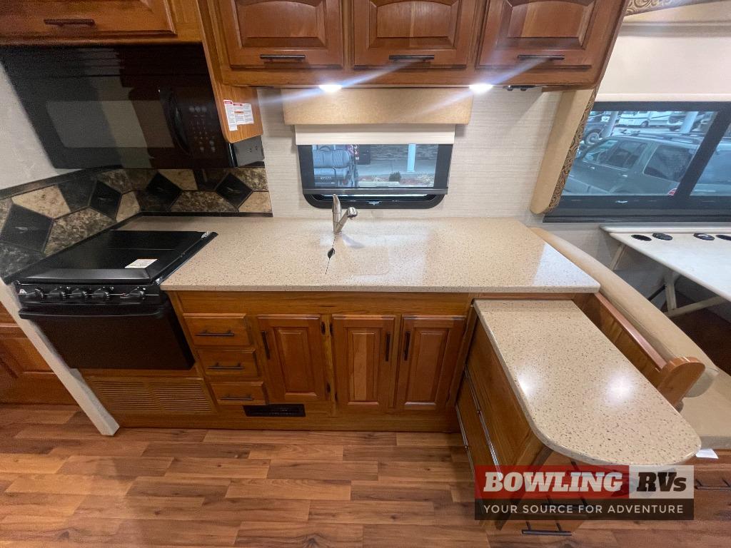 Above the cab you will find a bunk which helps to add additional sleeping space for your family, if you don't need the additional sleeping space then choose an optional front entertainment center. Also, you will find a TV above the cab. The full wall slide out features a dinette where you can enjoy meals, then at night use this area for additional sleeping space. Continuing along the slide out you will find a double sink, three burner range, overhead microwave, and a more overhead cabinets.