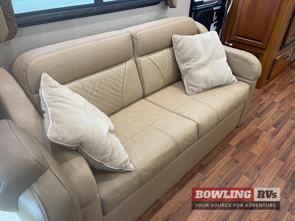 Step inside and you will find yourself in the combined kitchen and living area. The full wall slide out helps to open up the floor space. To the left of the entry door there is a refrigerator or you can choose an optional 12 cu. ft. refrigerator, and a pantry for your dry/canned goods. To the right of the door you will find a sofa with an overhead cabinet.