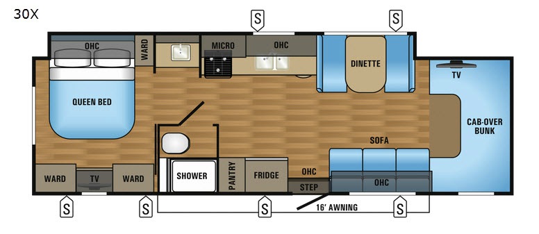 Outside enjoy exterior storage for all of your extra camping gear, plus enjoy the shade that the 16' awning provides, and more!
