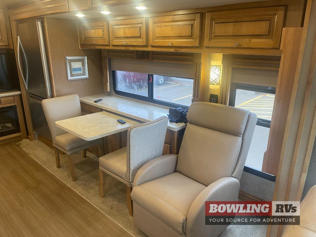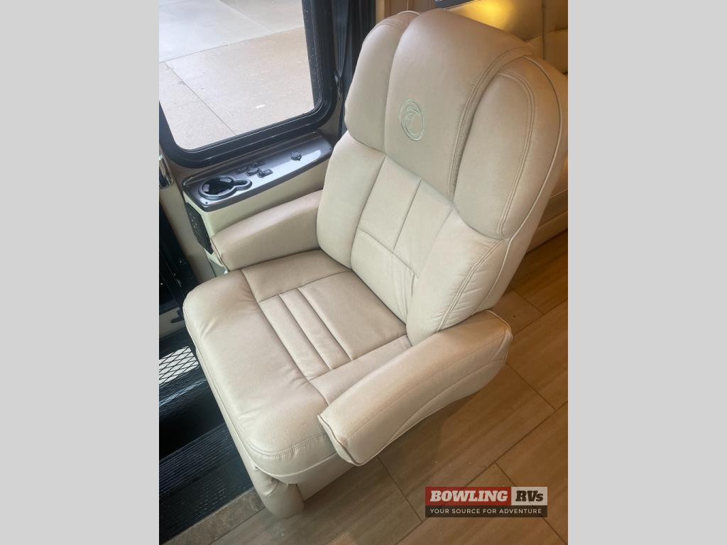 The front cab area features swivel captain and passenger chairs providing added seating when parked. There is plenty of storage in overhead cabinets along the front and both sides, plus there is an overhead TV in the cab.