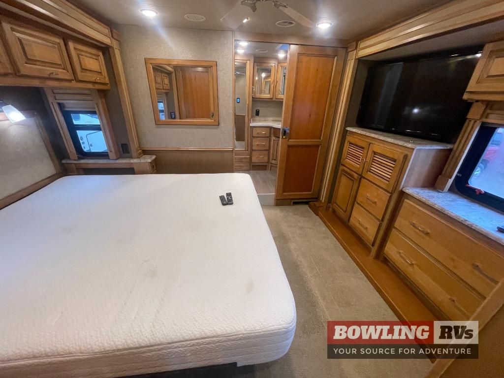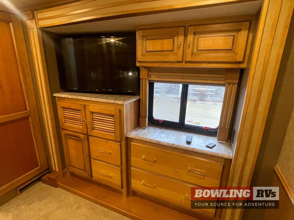 Next enjoy a bedroom area with slide out queen or optional king bed with nightstands at each side plus overhead storage. The wall opposite the bed has another slide that features a bank of drawers with cabinets above, plus a TV.