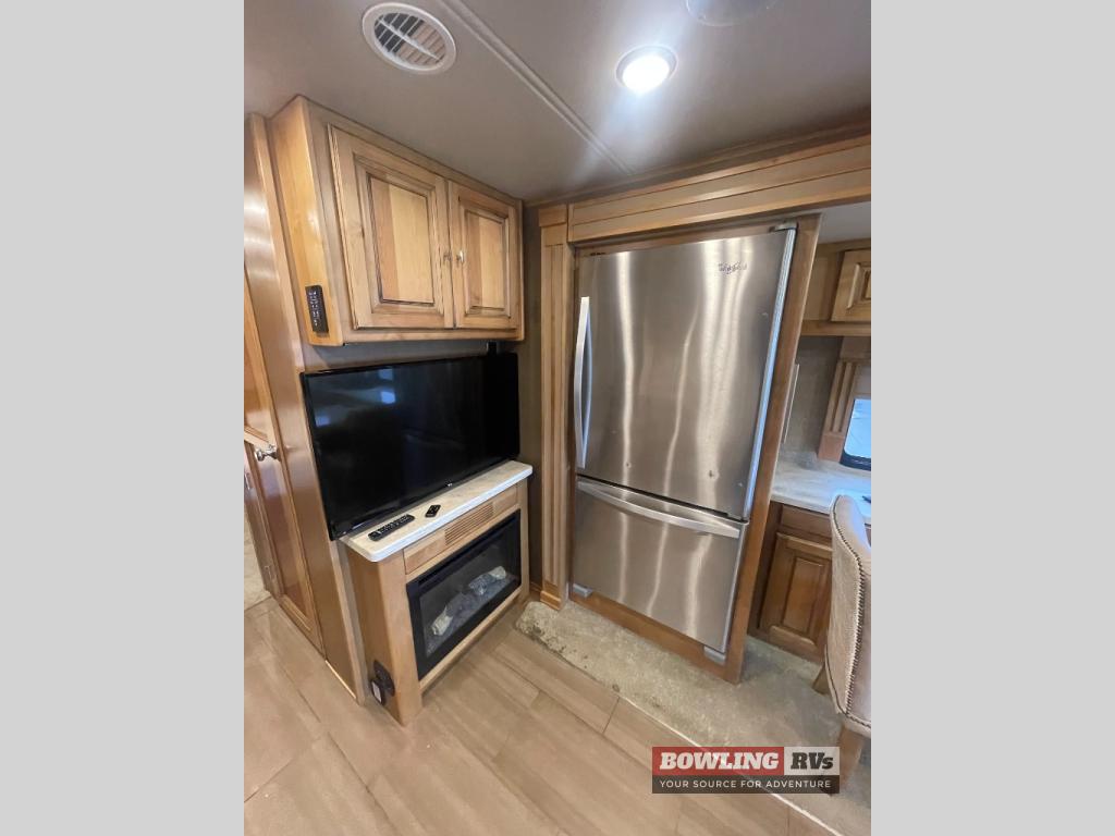A standard TV faces the front of the coach along the interior living room wall, and you can add an optional fireplace for those cool chilly nights when you want to just stay inside.