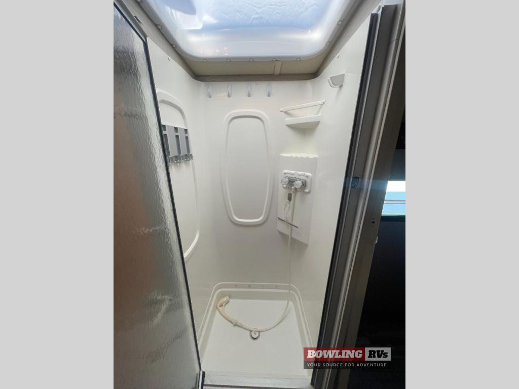 Just beyond the slide you will find a convenient shower along the curb side, and a private toilet area with sink along the road side including an overhead cabinet above the toilet. There is a folding door that can separate the bathroom from the bedroom area as well.