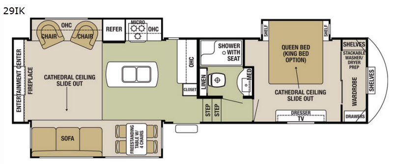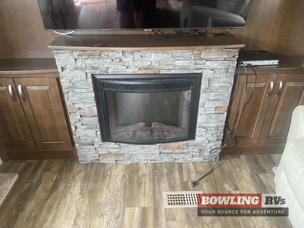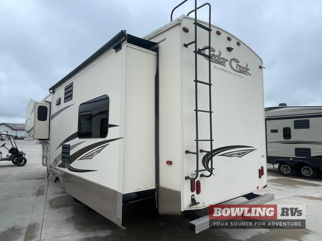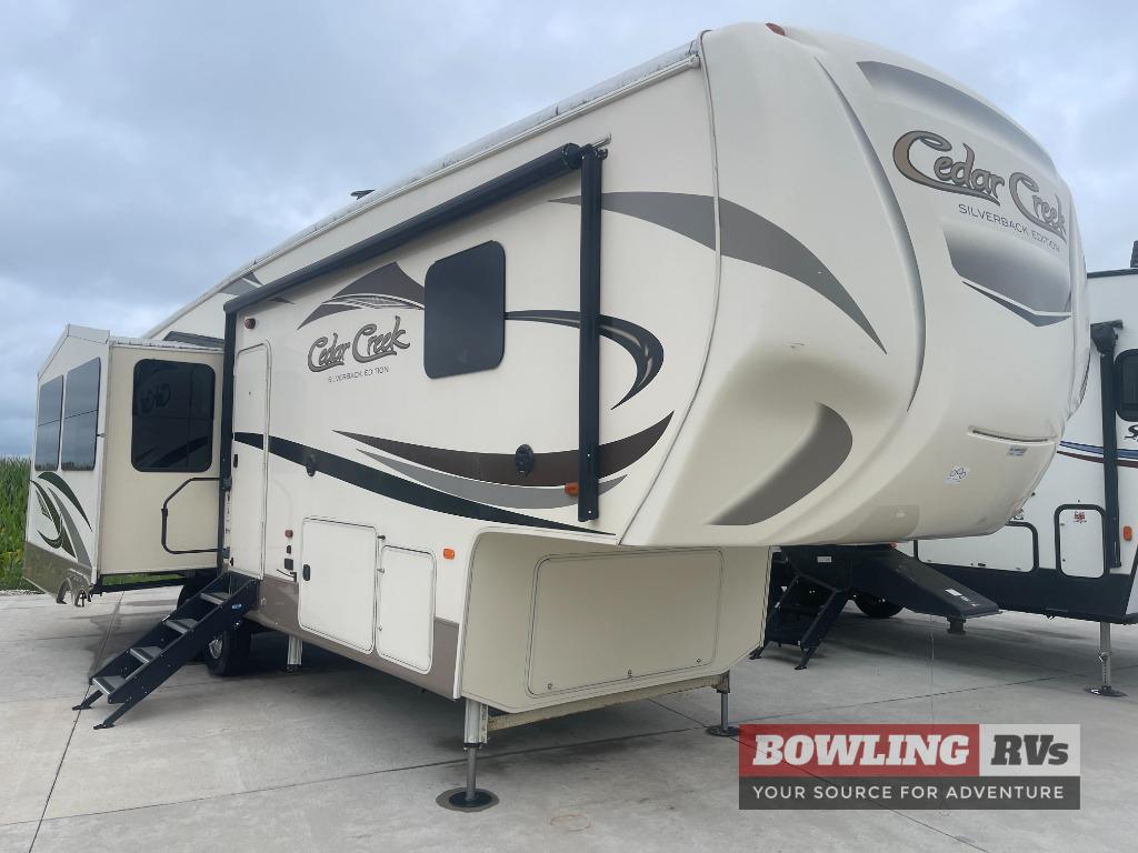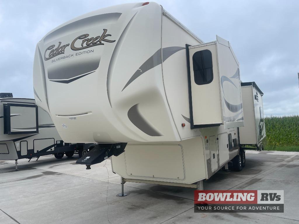 Easily load up your family and set out to your favorite campground for a relaxing time away from home with this Cedar Creek Silverback 29IK fifth wheel by Forest River. There is plenty of space throughout this model with triple slide outs. In the evenings enjoy watching a movie at the rear entertainment center or for those chilly evenings you can have a fire going in the electric fireplace. Meal prep is easy with all of the space in the kitchen. Here you will find an island with a double sink, a 19 cu. ft. refrigerator, plus plenty of counter space along the interior wall. When it is time to retire at night come do so in the spacious front bedroom where you will find a Serta queen bed or you can choose an optional king bed. You can even finish out the evening by watching a movie at the 32" TV in the bedroom, plus more!