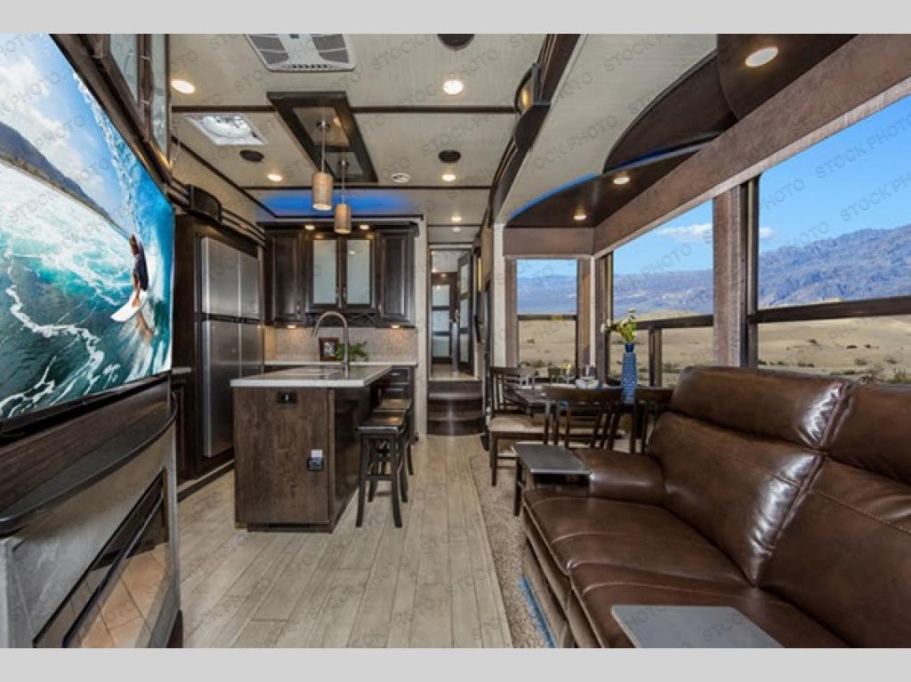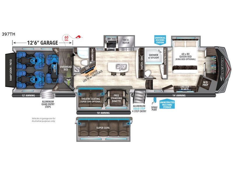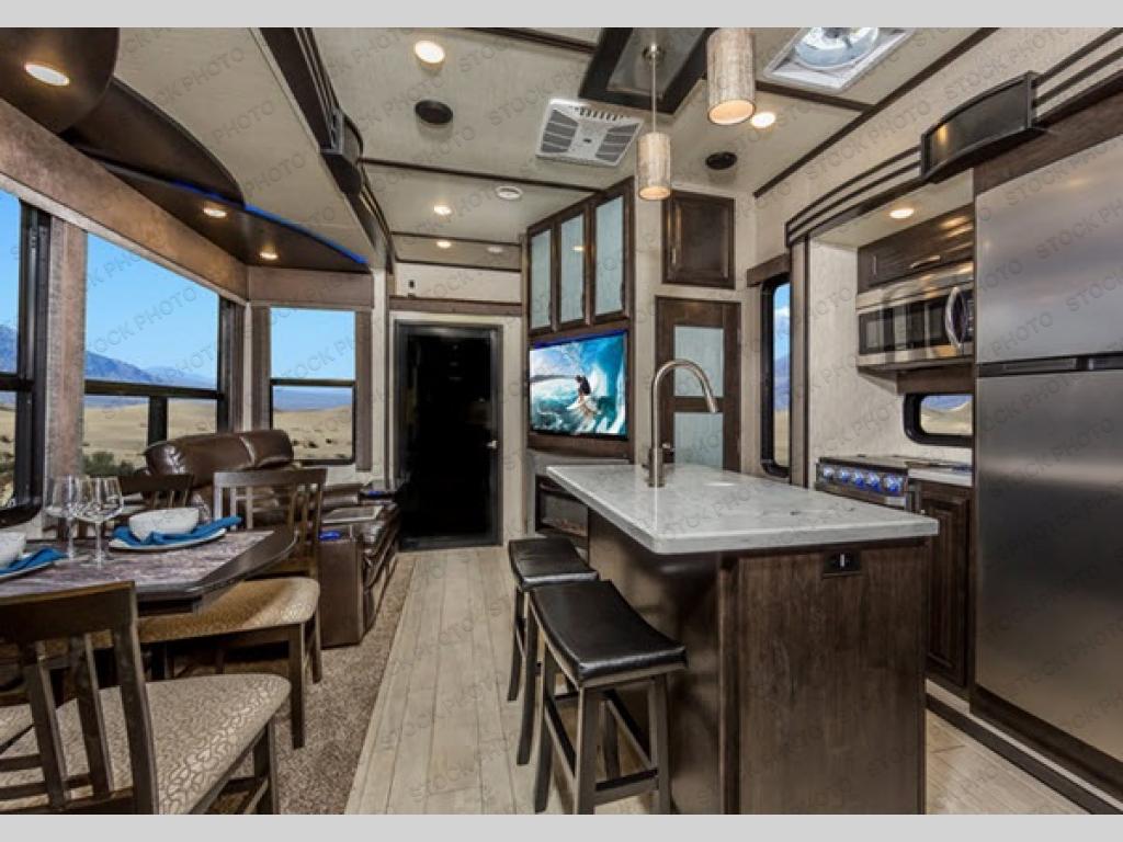 If your off-road toys have been calling your name, hitch up this Momentum 397TH fifth wheel toy hauler after loading your toys in the 12'6" garage. You will be able to clean up after getting muddy from the trails in the full bathroom in the garage or the second full bath next to the bedroom. The kids can sit on the bar stools at the kitchen island while you cook, or relax on the dinette and theater seats while watching the 49" LED TV and fireplace. There are several options to choose from, and many more features to enjoy such as the dual entry doors, loft, and exterior unobstructed pass-through storage, plus more!