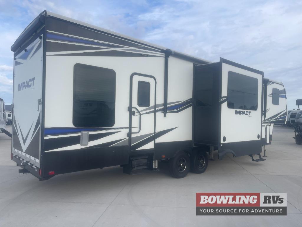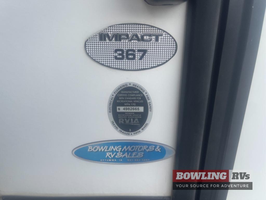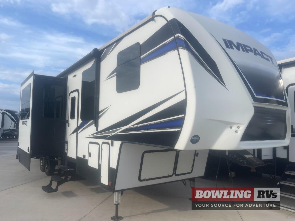 Spend a lot of time outside with this Keystone Impact toy hauler fifth wheel model 367. There are dual awnings, just open them up, add a few camp chairs and enjoy a beautiful day outside. There is also an 8' ramp that helps you unload your toys quickly and easily so getting to your offroad adventuring is a breeze. The interior of this unit is perfect for those days where you may not be able to be out and about. There are triple slide outs which open up the space inside. The private front bedroom has a full walk around queen bed and a full wardrobe. Once all the toys are unloaded there are dual opposing sofas, a half bath, and an electric queen bed that comes down for sleeping space at night. The loft is a place the kids may have to draw straws for!