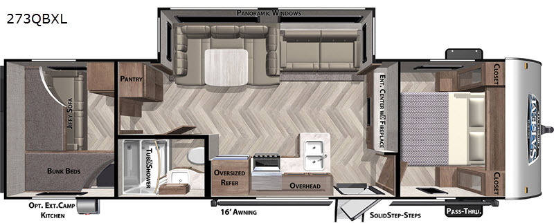 You and your family can invite the cousins or your friends to join you each trip with sleeping space for nine when you also utilize the furniture at night. The kiddos will love having the private bunkhouse all to themselves which includes three bunks and a Jiffy sofa, plus a wardrobe for their clothing. After a day at the lake, everyone can take turns getting cleaned up in the full bath before meal time. The cook will appreciate having a microwave for quick meals and a three burner cooktop. The sofa and U-shaped dinette offer dining and relaxing space inside, and the 16' awning provides an outdoor living space that is covered. You can choose to add an optional exterior camp kitchen if you like, and store all your outdoor cooking items and camp chairs in the pass through storage.