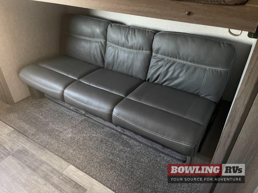This dual entry, dual slide fifth wheel is perfect for your family or large group! The private bunkhouse includes a jackknife sofa with a flip-up bunk above, a convenient trundle bed, plus a second bunk with wardrobe space below. The chef of the family can prepare meals each day on the three-burner cooktop, and everyone can dine around the U-shaped dinette or sit under the power awing outside. This model also includes a tri-fold sofa for additional guests, and the front master suite features a queen bed and its own half bath!