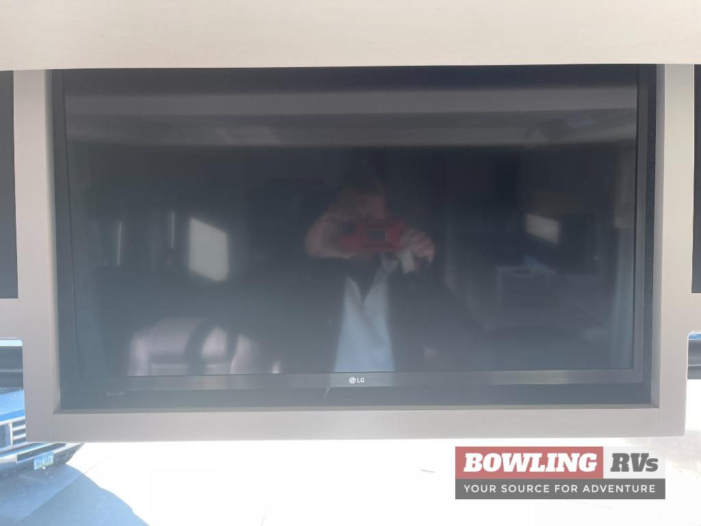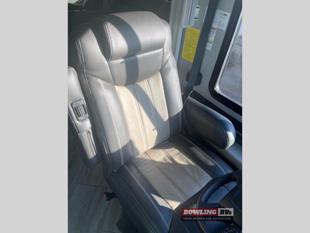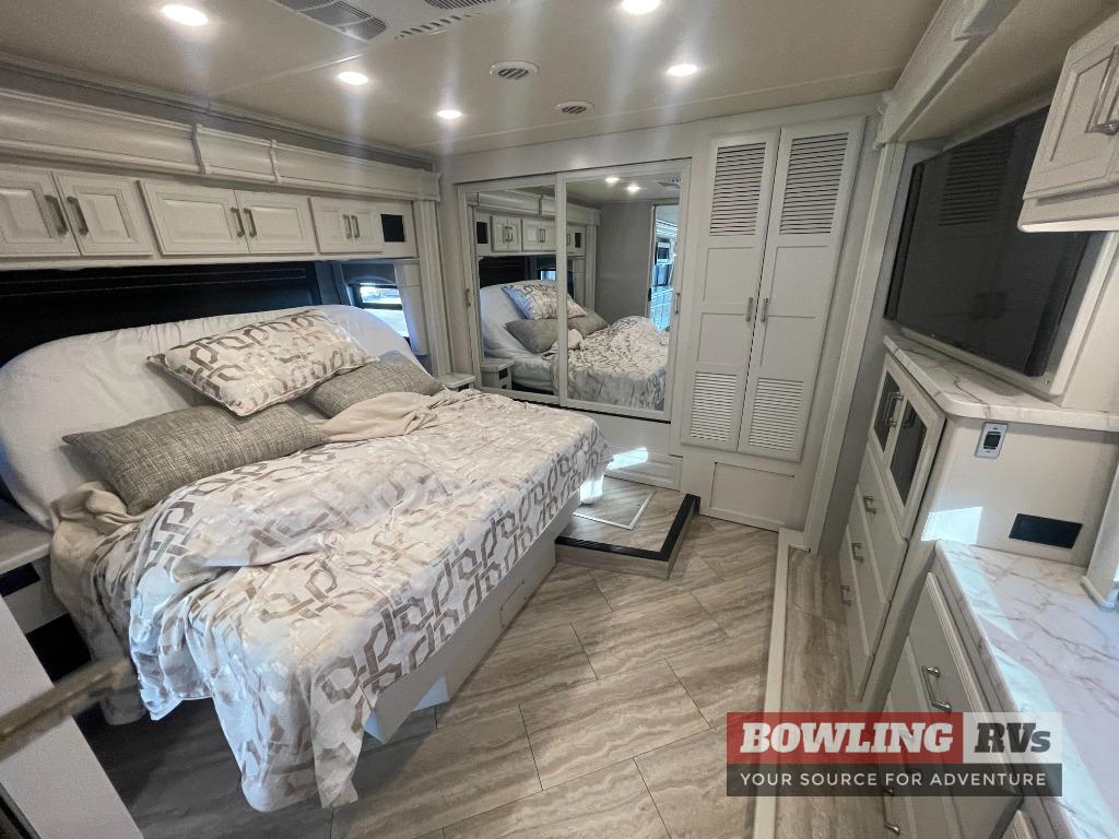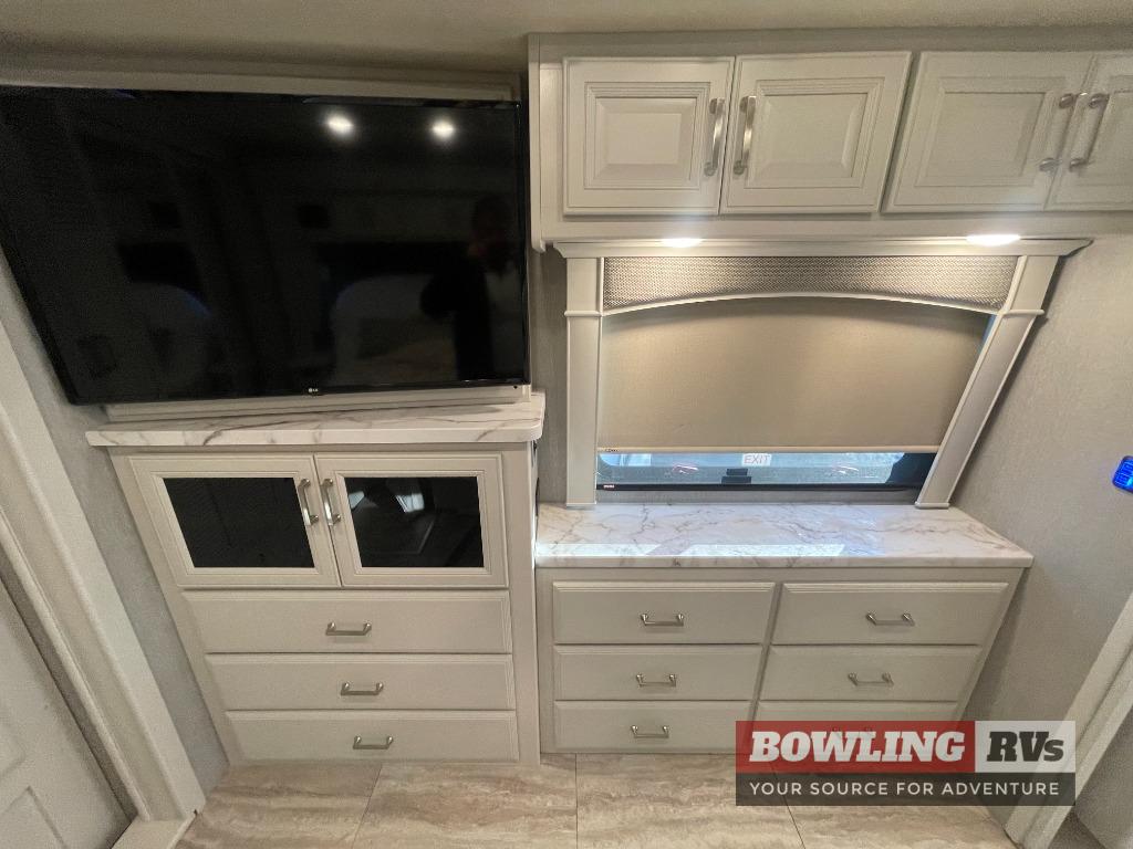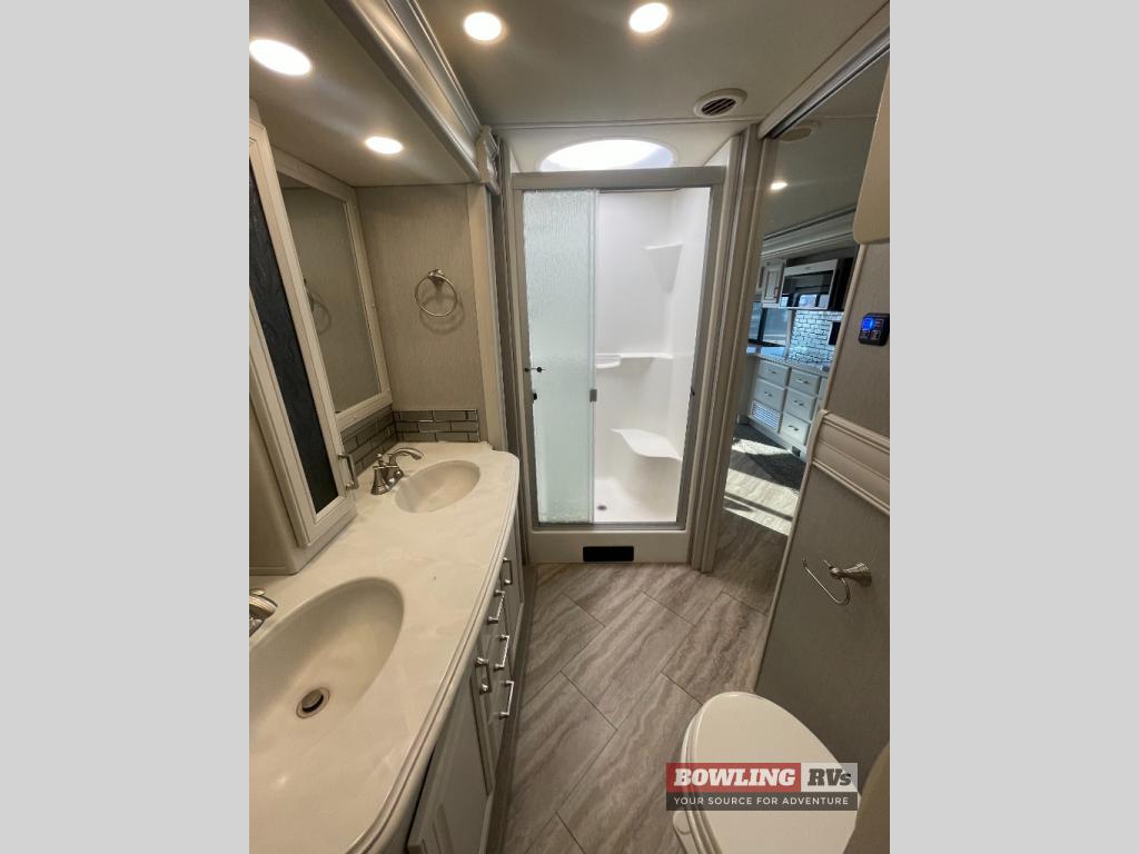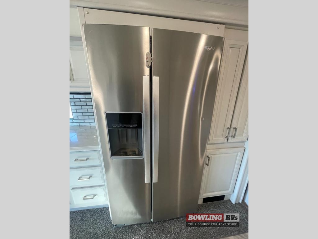 You and your spouse will enjoy traveling or living in this coach with its spacious living and kitchen area as well as bedroom and bathroom thanks to the four slide outs! You might claim the free standing recliner as yours while your spouse enjoys the sofa sleeper when reading a book. You can dine or work from the free-standing dinette with credenza and enjoy the Roadwire power cockpit seats when friends come to visit. The cook will love using the induction cooktop and convection microwave, plus the 21 cu. ft. residential refrigerator. There is plenty of TV choices throughout; a 49" TV in the living room, a 43" TV in the bedroom, a 32" cab TV and a 43" exterior TV! The bathroom features a double sink vanity and two entries, and the rear master bedroom allows you to sleep on a king-size Dream Easy Serenity memory foam mattress with adjustable head while watching TV. This model even includes a stackable washer and dryer that you are sure to love!