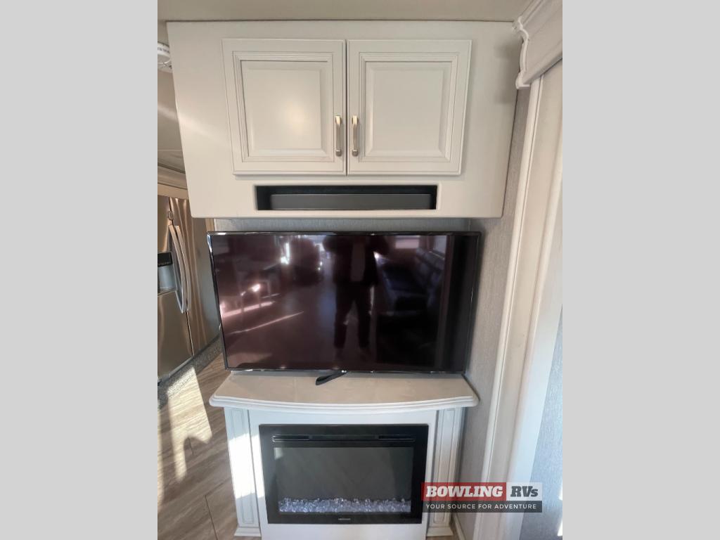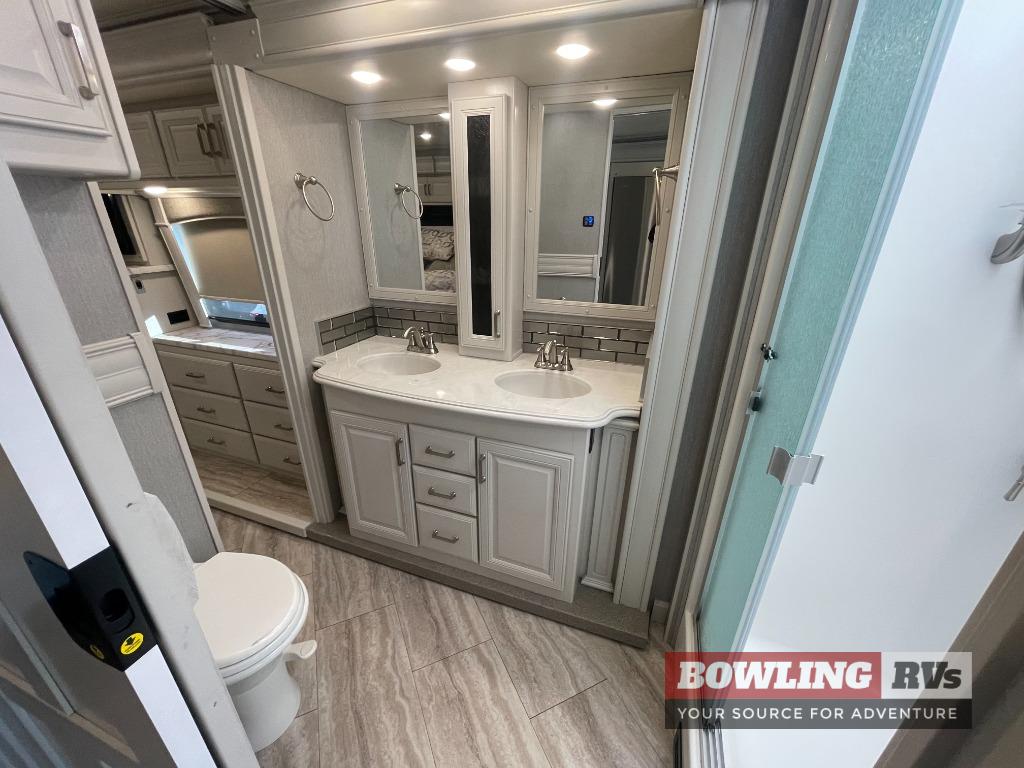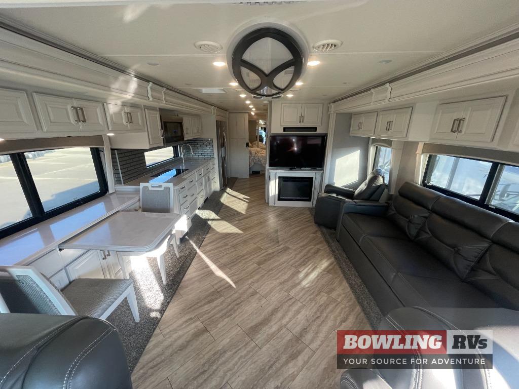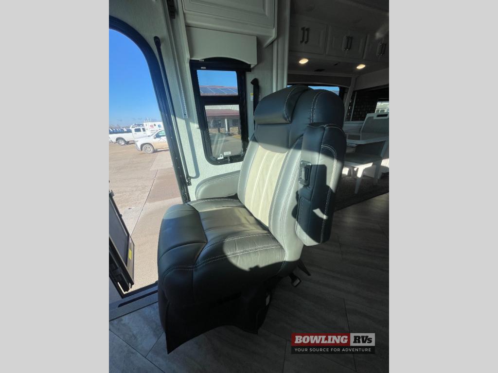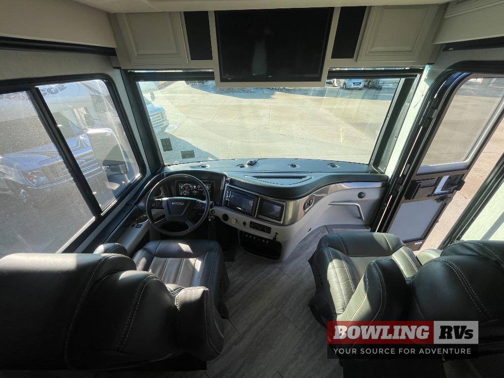 You and your spouse will enjoy traveling or living in this coach with its spacious living and kitchen area as well as bedroom and bathroom thanks to the four slide outs! You might claim the free standing recliner as yours while your spouse enjoys the sofa sleeper when reading a book. You can dine or work from the free-standing dinette with credenza and enjoy the Roadwire power cockpit seats when friends come to visit. The cook will love using the induction cooktop and convection microwave, plus the 21 cu. ft. residential refrigerator. There is plenty of TV choices throughout; a 49" TV in the living room, a 43" TV in the bedroom, a 32" cab TV and a 43" exterior TV! The bathroom features a double sink vanity and two entries, and the rear master bedroom allows you to sleep on a king-size Dream Easy Serenity memory foam mattress with adjustable head while watching TV. This model even includes a stackable washer and dryer that you are sure to love!