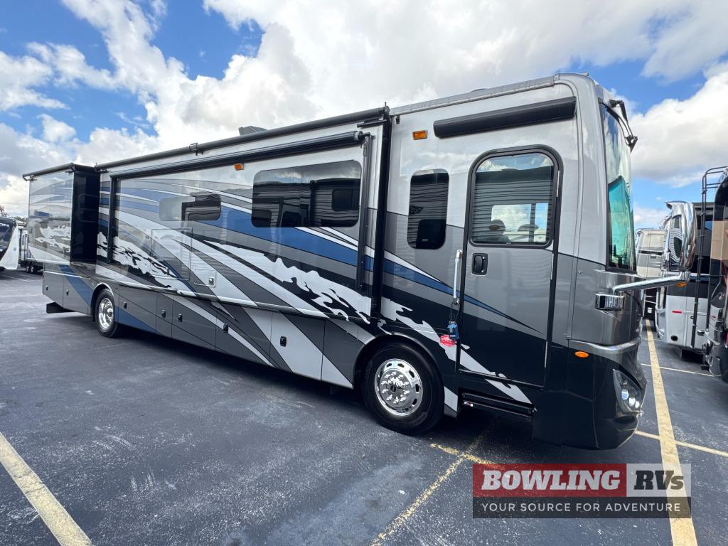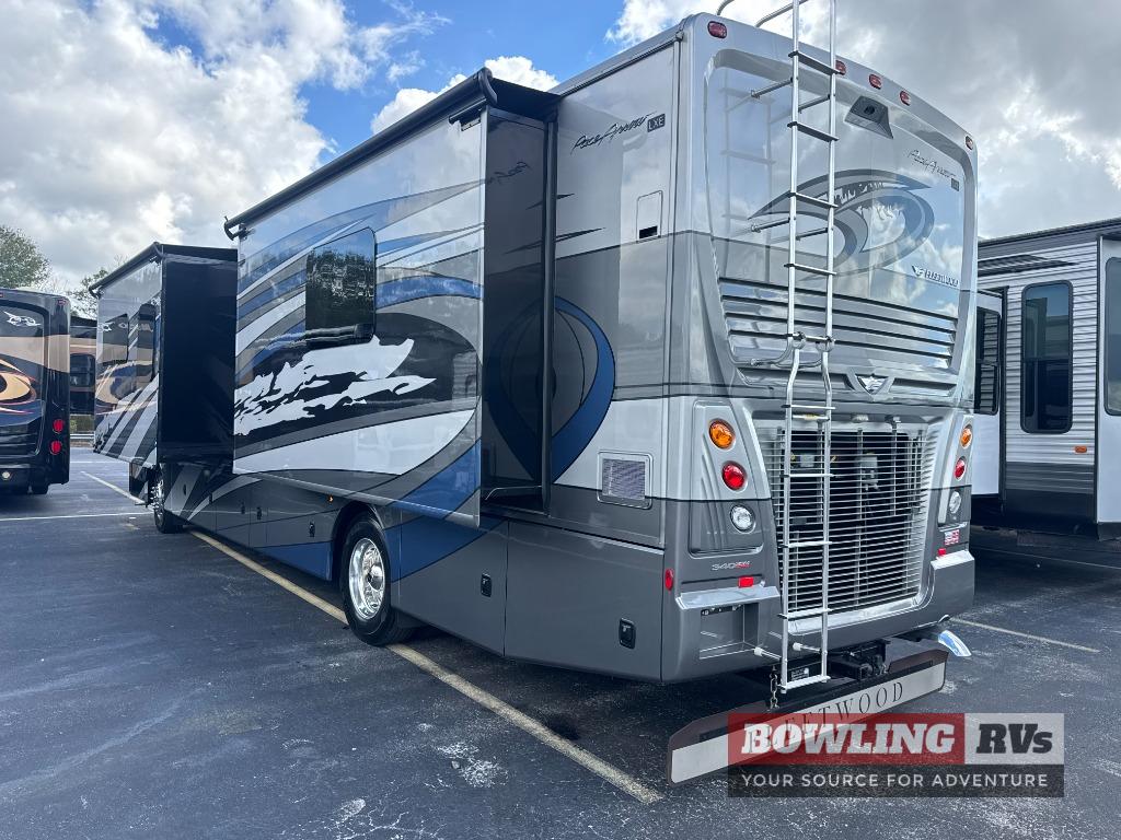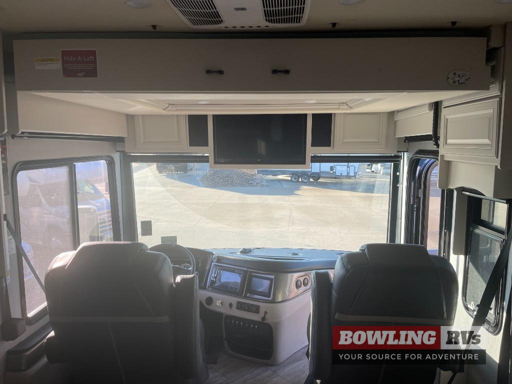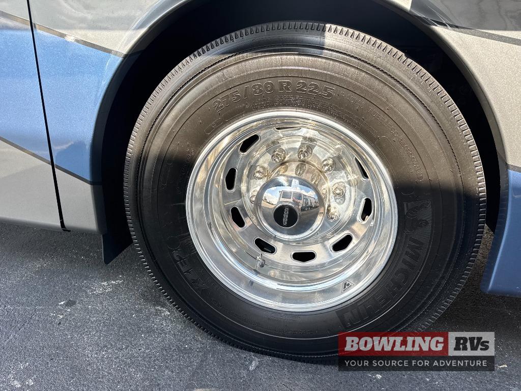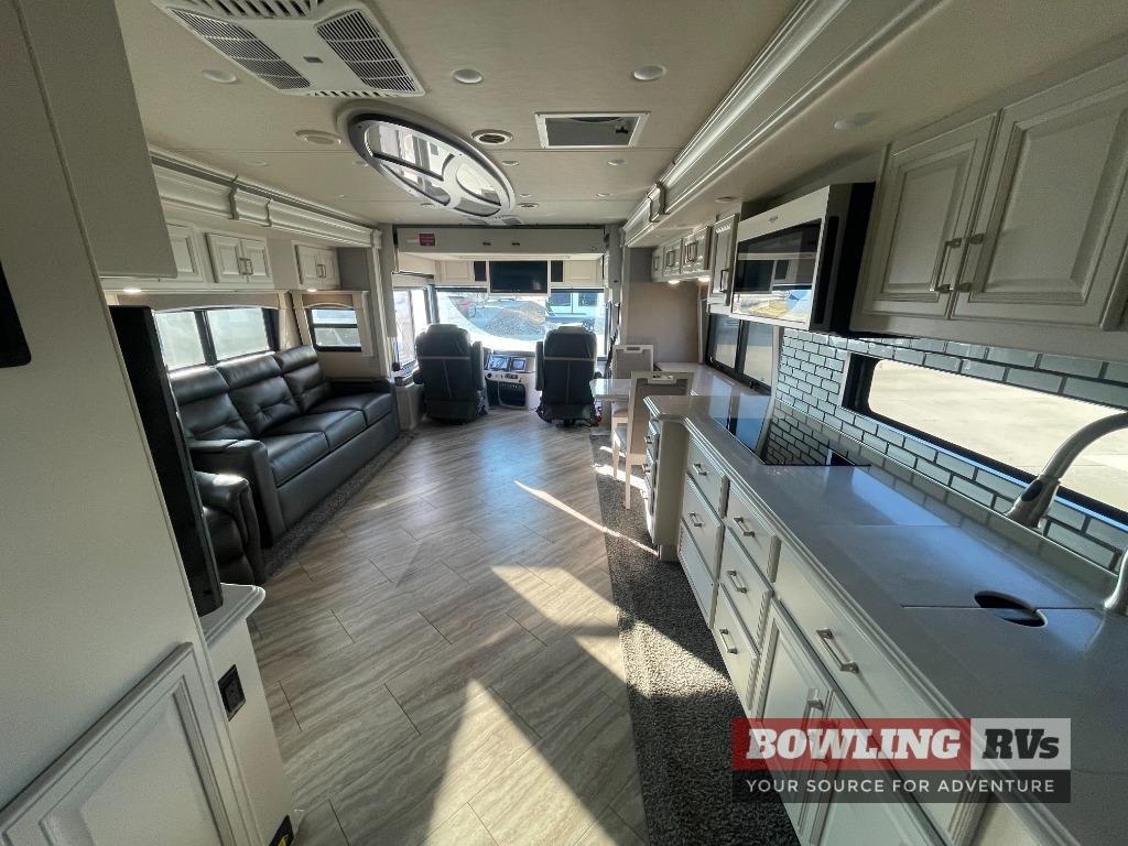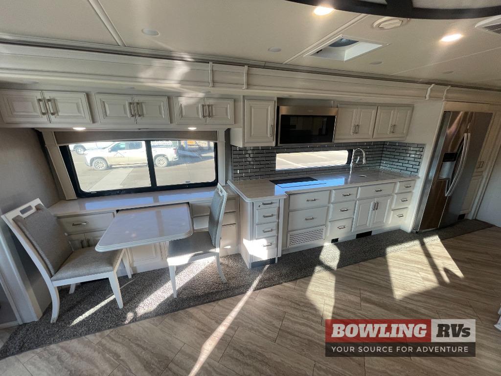 You and your spouse will enjoy traveling or living in this coach with its spacious living and kitchen area as well as bedroom and bathroom thanks to the four slide outs! You might claim the free standing recliner as yours while your spouse enjoys the sofa sleeper when reading a book. You can dine or work from the free-standing dinette with credenza and enjoy the Roadwire power cockpit seats when friends come to visit. The cook will love using the induction cooktop and convection microwave, plus the 21 cu. ft. residential refrigerator. There is plenty of TV choices throughout; a 49" TV in the living room, a 43" TV in the bedroom, a 32" cab TV and a 43" exterior TV! The bathroom features a double sink vanity and two entries, and the rear master bedroom allows you to sleep on a king-size Dream Easy Serenity memory foam mattress with adjustable head while watching TV. This model even includes a stackable washer and dryer that you are sure to love!