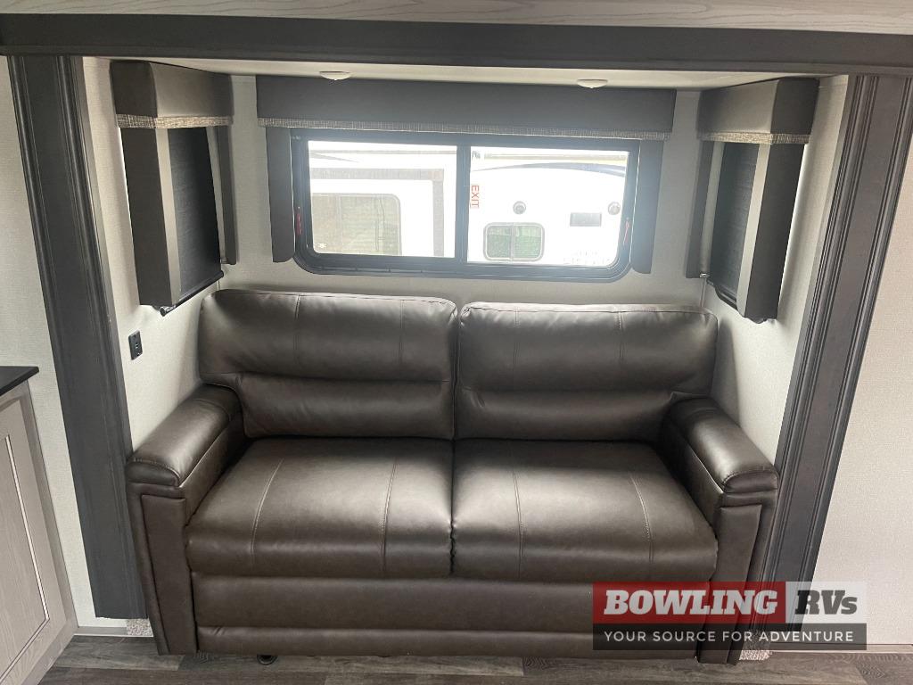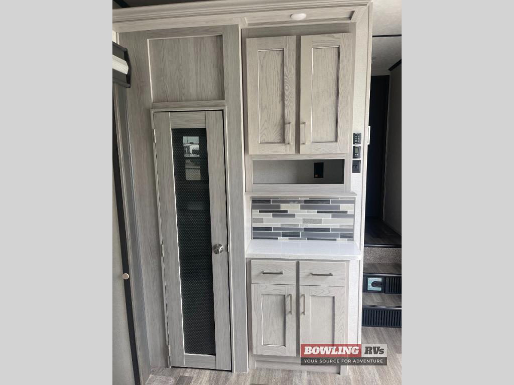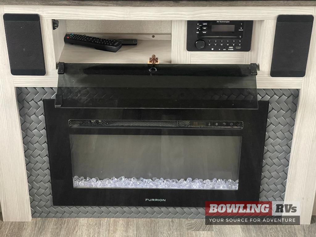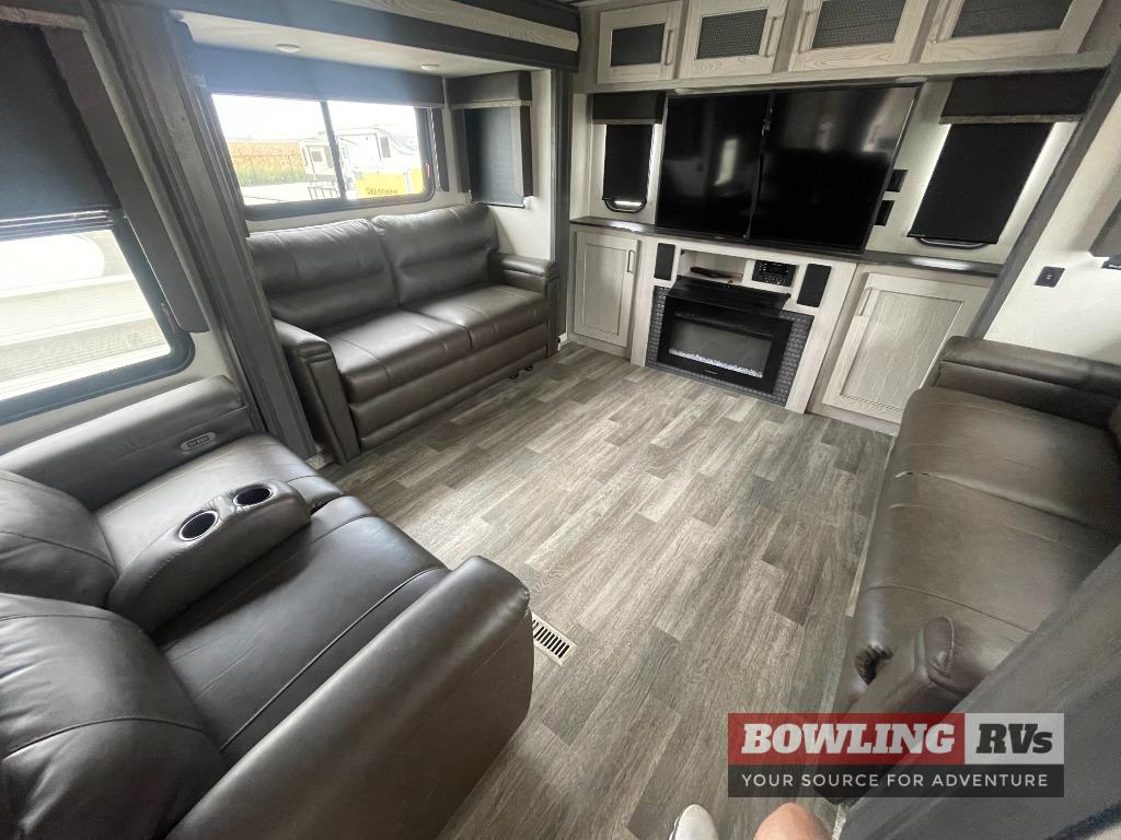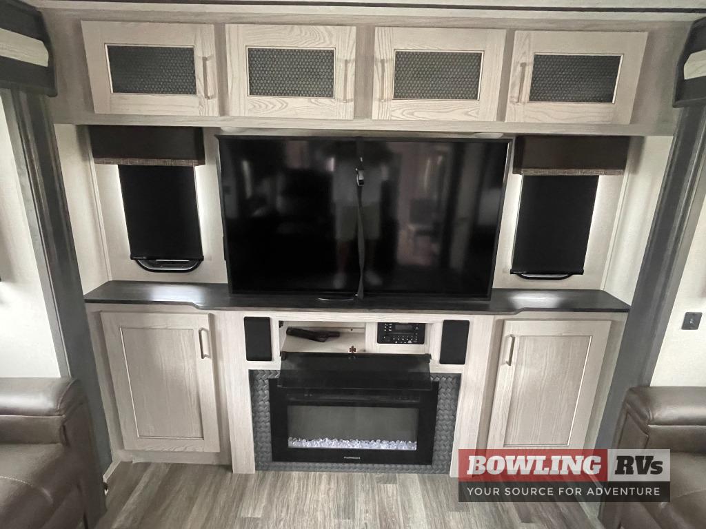 You and your family will enjoy the separate elevated den while watching the LED HDTV above the fireplace on either the dual hide-a-bed sofa slide outs, or the power theater seats. The separate kitchen area features a coffee station for the coffee lover in the family, a large pantry for your canned goods and snacks, a range with a glass top, and a residential refrigerator, plus a residential microwave. Outside you will find an outdoor living space under the awning once you place your camp chairs and mat down. The exterior storage tray slide out allows you to bring those larger items such as fishing poles, an outdoor table, and extra totes.
