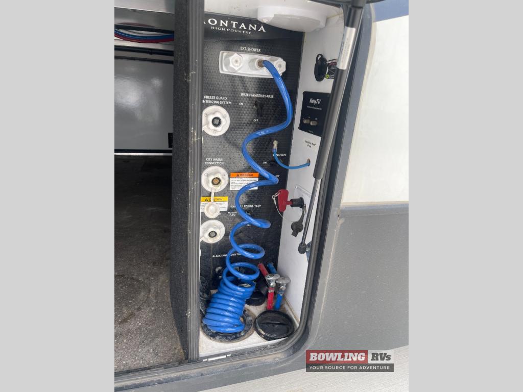 With each Montana High Country fifth wheel by Keystone you will enjoy family-friendly features, lightweight floorplans, and drop-frame construction for maximum storage. Each model is built for four season living with the heated and enclosed underbelly and the astrofoil insulated slide floors and underbelly. The Mystic Ash cabinetry, hardwood decorative slideout fascia, and accent crown molding create a luxurious fifth wheel everyone can get used to. These models include a Whisper Quiet A/C system to cool your space quietly and evenly, plus there is a 35,000 BTU furnace that will allow you to extend your camping season. The Montana High Country fifth wheels are equipped with a Road armor shock absorbing hitch pin for easy towing, and set-up will be a breeze with the Hitch Vision with LED lighting. There are many more features to love about these fifth wheels, like the MaxTurn front cap, the Solera series power awning(s), the residential appliances, and the list goes on!