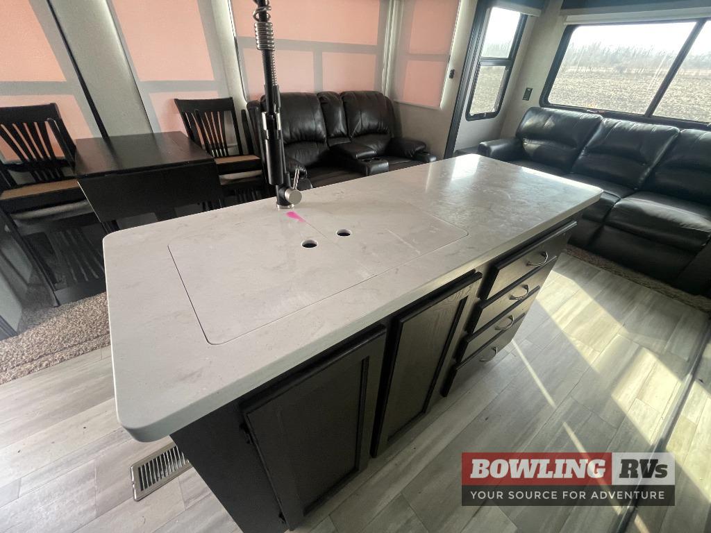 This family-friendly fifth wheel can sleep six comfortably between the queen bed, the tri-fold sofa, and the middle bunkhouse with a loft above! There is plenty of counter space in the bunkhouse, plus a sofa with a removable table and a wardrobe for clothes. The kitchen is any chef's dream with its residential cooktop, residential refrigerator, and kitchen island for more counter space. While dinner is being made, you can play a game of cards at the free-standing table, relax on the tri-fold sofa, or visit outdoors under the 20' power awning with LED lights. You won't be left wanting for storage space in this model thanks to the overhead cabinets, plus the bedroom dresser and large wardrobe. There is even a wardrobe with washer and dryer prep if you choose to go full-time!