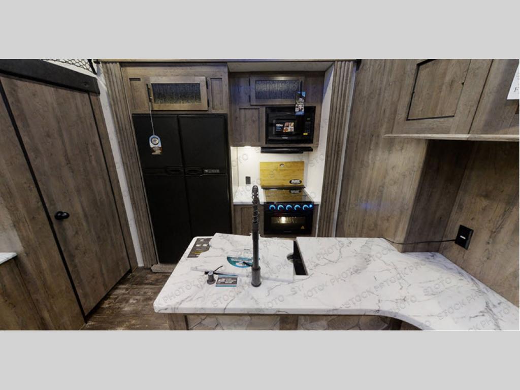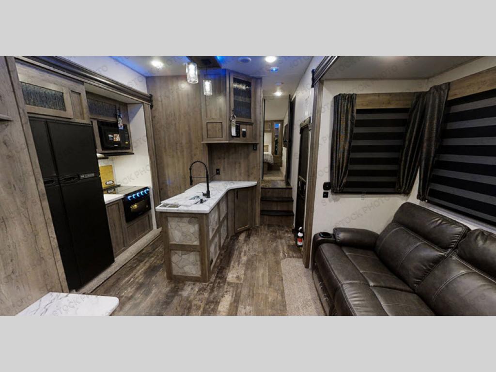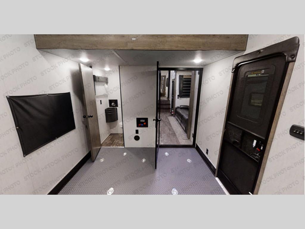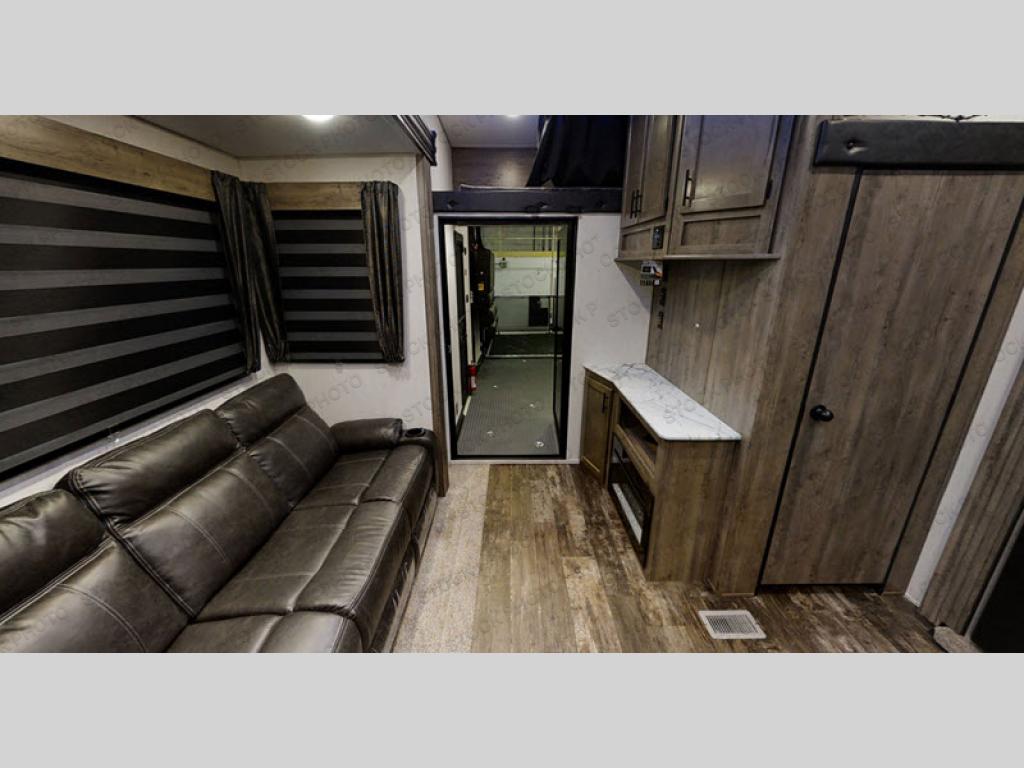 If you need a toy hauler big enough for your whole gang and your toys then look no further! It features a wrap-around loft above the 13' garage area which has a folding dinette table below a Happijac bed lift system, an area prepped to an optional washer and dryer, and a half bathroom, plus there is one of the dual entry doors to the unit and a 96" x 96" ramp door "party patio". The U-shaped dinette is great for meals, games, and even sleeping but it can be switched out for the optional party recliner sofa instead. You also have a great view from here of the entertainment center with a fireplace. After enjoying a good night's rest on the 67" x 74" Wolf Pack king bed in the front private bedroom, you can head directly into the dual entry bathroom to freshen up in the radius shower!