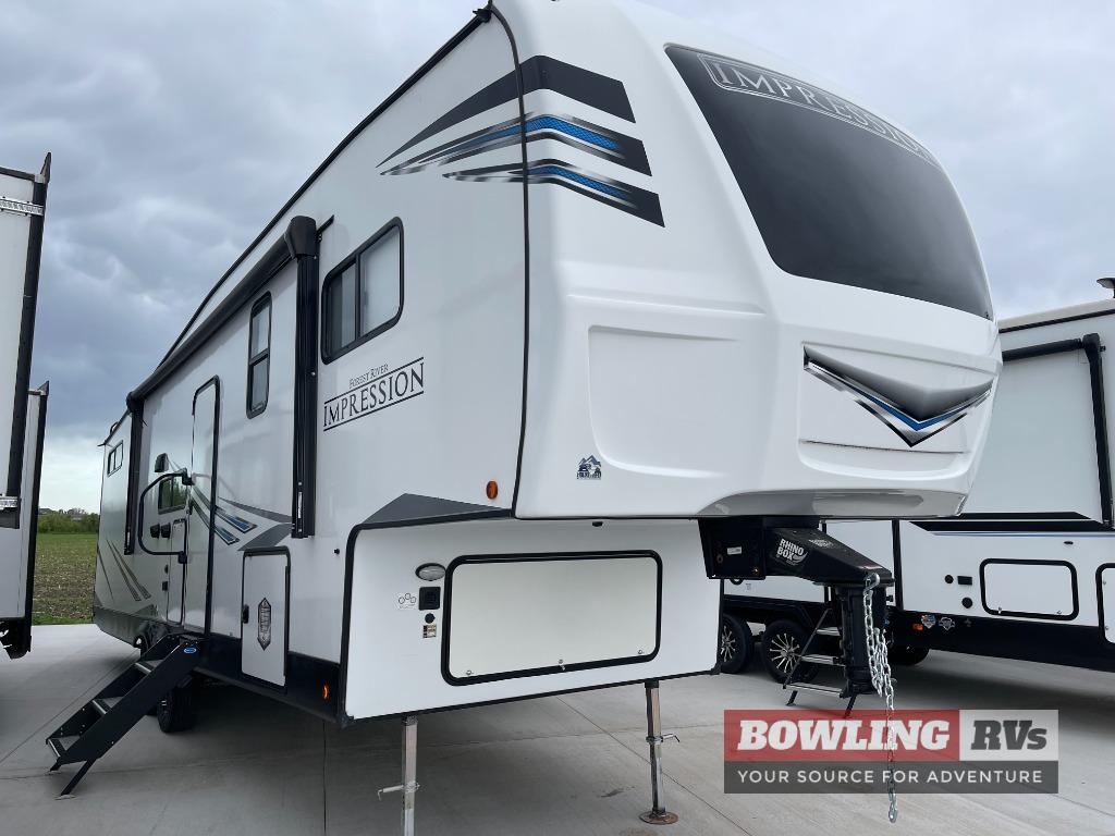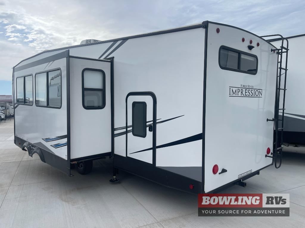 With any Impression mid-profile fifth wheel by Forest River, the focus of the design is comfort and value, built with quality craftsmanship and attention to customer's desires in each Impression! The exterior includes upgraded E-rated Goodyear Endurance tires made in the U.S.A., custom exterior graphics package, and One Touch automatic leveling system for easy setup. There is also an enclosed docking station and a gel coat fiberglass front cap with an automotive windshield with LED lights for style and beautiful views. The fully heated and enclosed AccessiBelly has removable underbelly panels and offers four seasons of travel. The interior has oversized opening windows in the living area for more natural lighting and good air flow, a stainless steel single bowl sink with high rise faucet with a pulldown sprayer to easily clean the dishes, and a porcelain foot flush toilet to mention a few comforts and conveniences.
