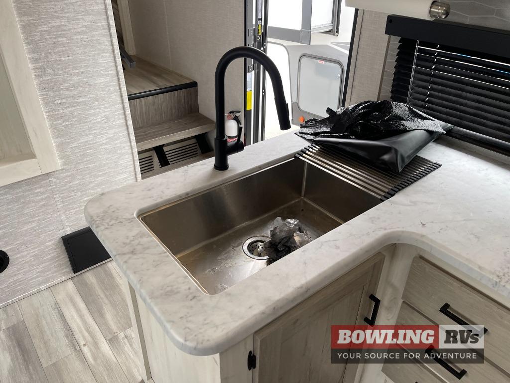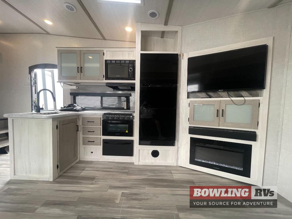 This fifth wheel is going to make an impression on anyone that steps foot inside or walks around the outside! From having a second entry/exit door into the rear bunkhouse and a main entry into the living and kitchen area, plus having an outside kitchen to make meals in the great outdoors, nobody will ever want to go home! The rear bunkhouse also includes a Versa queen bed plus two flip-down upper bunks, plus storage. The front bedroom gives you privacy from everyone and there is a walk-around queen bed, three wardrobes and a space prepped for a washer/dryer option. The full bathroom will keep everyone refreshed, and the inside kitchen has full amenities including an L-shaped counter. There is hidden storage behind the 40" LED TV with fireplace below.
