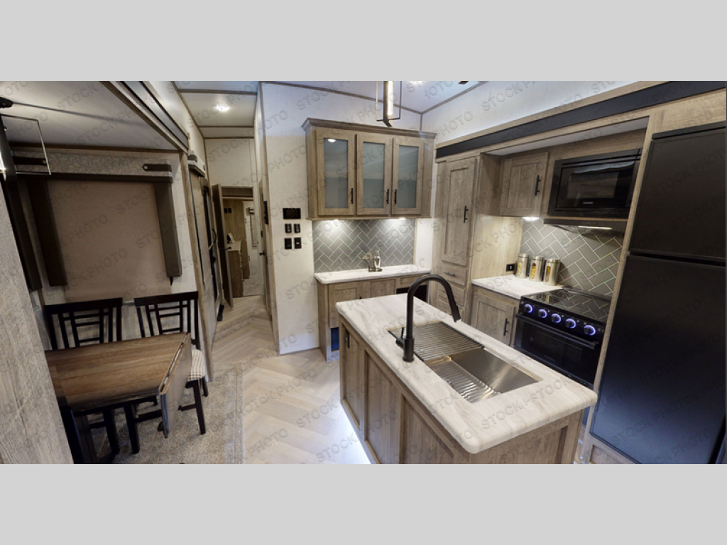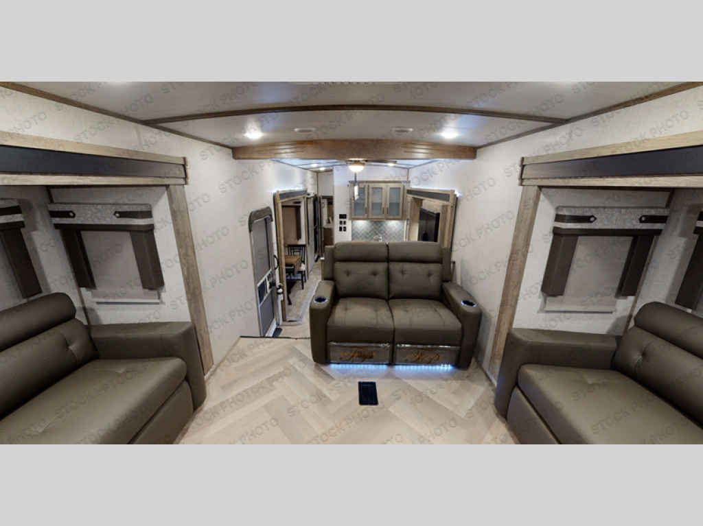 This fifth wheel is decked out in features you're going to love from the front separate living area to the Texas-sized exterior pass-through storage area! The two tri-fold sofas can convert into sleeping space and the reclining sofa is the perfect place to relax while you watch your favorite movie on the 50" LED TV. The kitchen island not only makes meal prepping easy, but cleaning up just as easy with the large sink. Everyone will enjoy getting ready each morning in the full bathroom with the residential walk-in shower and a vanity sink next to it. The rear private bedroom has everything you will need to feel right at home with the custom king bed, the wardrobe that is prepped to add the optional washer and dryer, and the large panoramic window on the rear wall to let in some morning sunlight. Plus, there are stairs just outside the bedroom that lead up to the loft with two mats and storage areas!