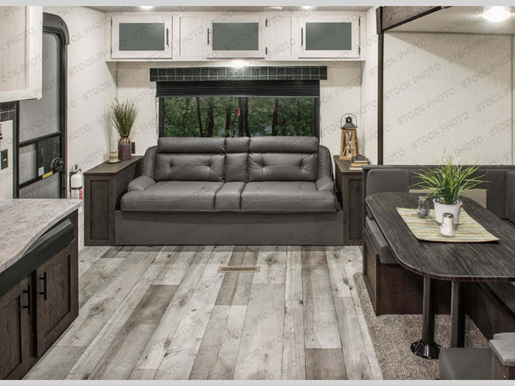 This model features dual entry doors which will make camping easier than ever! You can enter in through the front private bedroom, or the rear living area. The walk-through bath is easily accessible to everyone, and the large slide included in this model will provide the dog space to stretch out. Your crew can play a game around the U-shaped dinette after dinner, or head outdoors to relax under the 20' power awning with LED lights. You'll also find a 70" sofa in the rear living area that will be perfect for overnight guests. Don't let this model slip away!