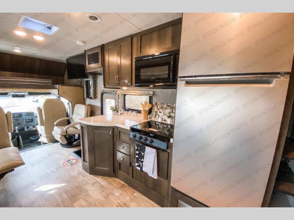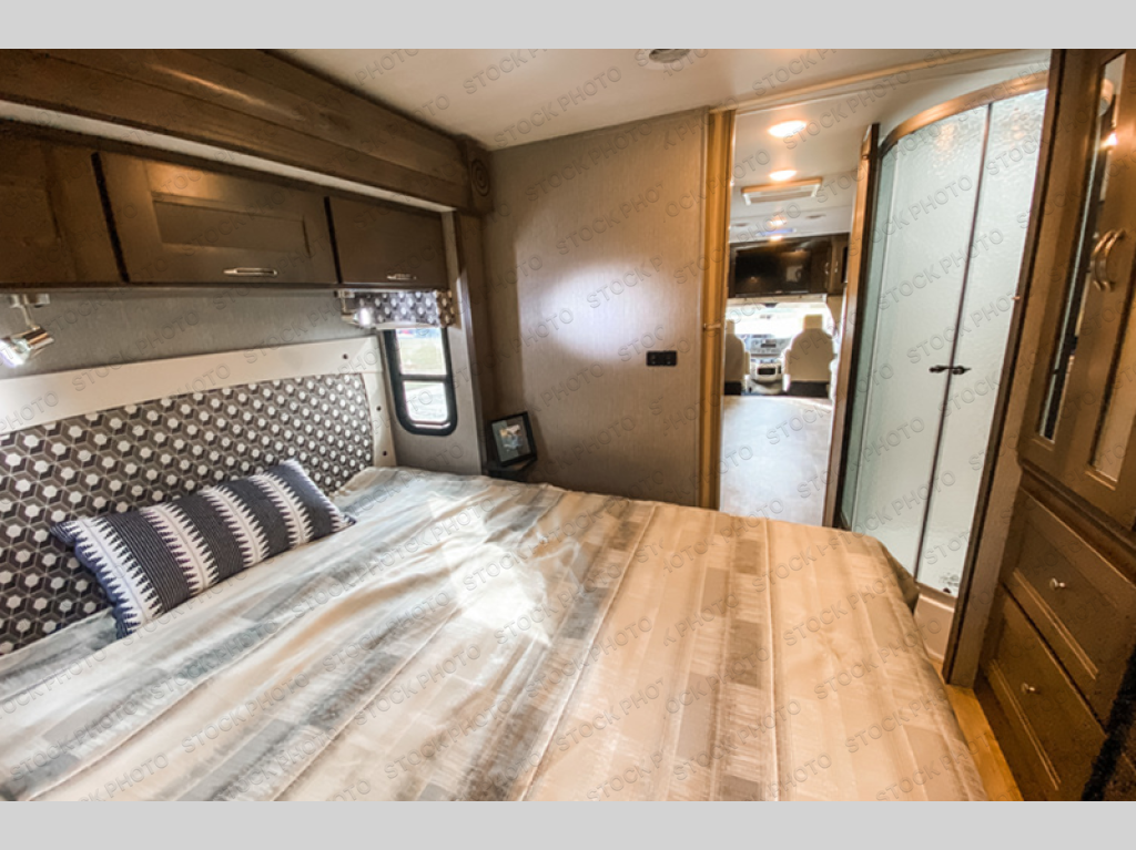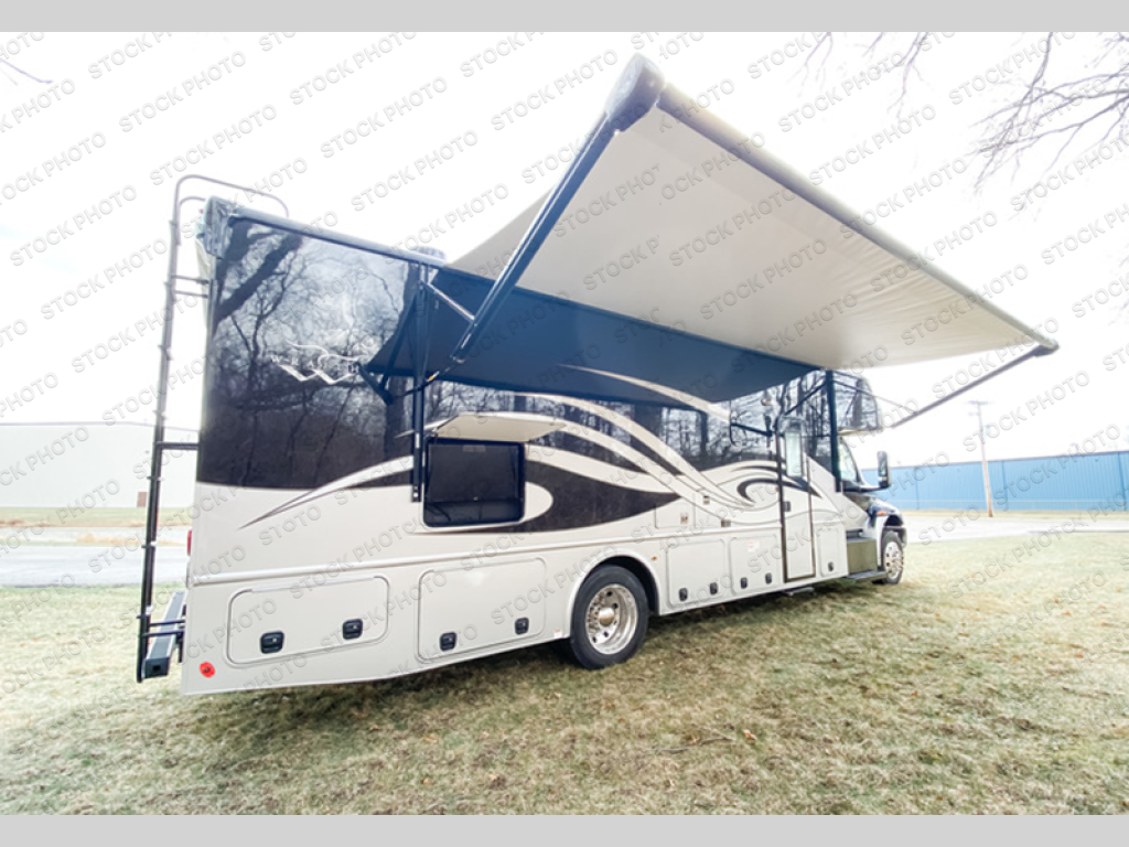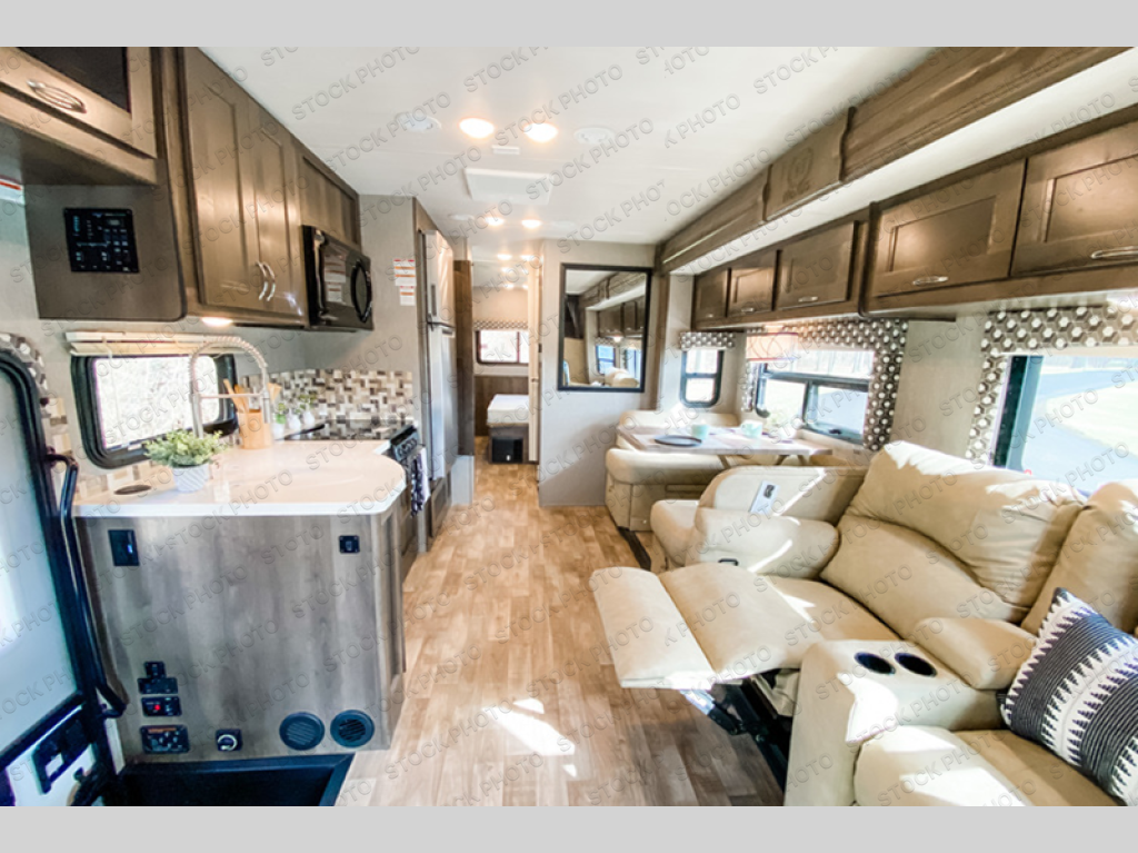 Enjoy a home away from home with this motorhome! The rear private bedroom has a queen bed slide to lay your head on at night with an optional LED TV that can be added across from it, plus the radius shower of the separated bathroom opens up into the bedroom and the toilet and sink are in their own private area. The bunk over cab offers another comfortable place to sleep and comes with a 40" flat screen TV for entertainment at night while relaxing on the deluxe tri-fold sofa. Prepare your best home cooked meals with the three burner cooktop and enjoy them at the deluxe dream booth dinette with storage for your games!