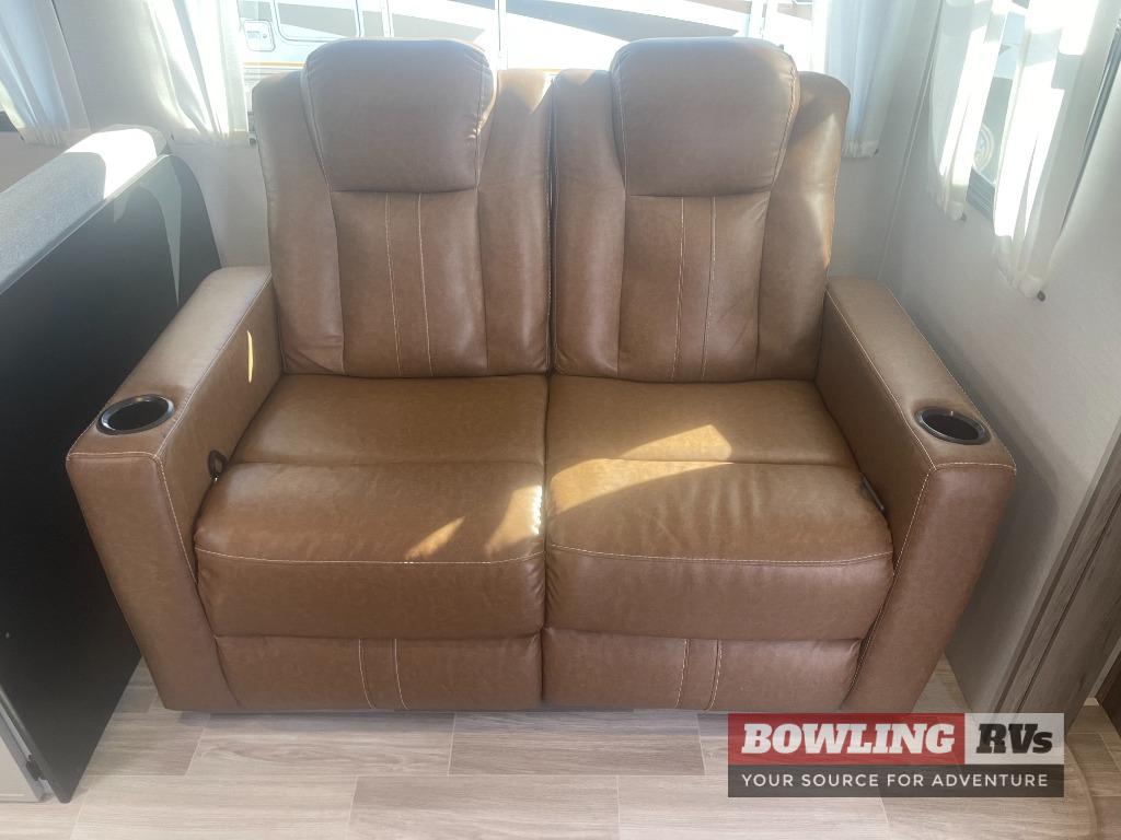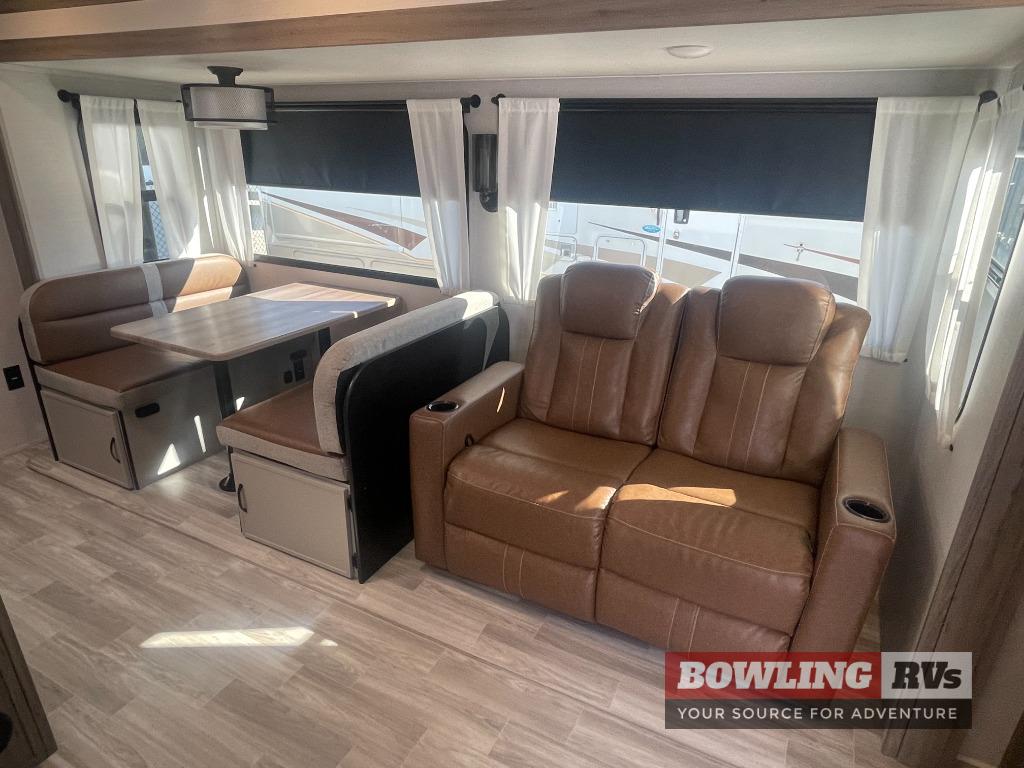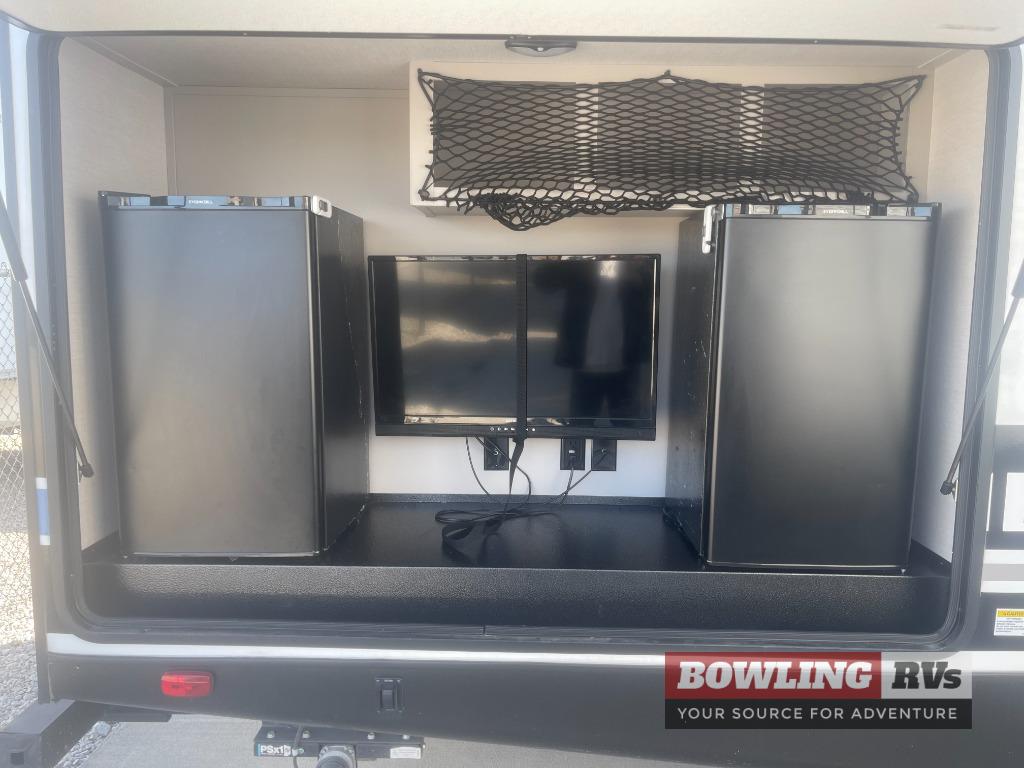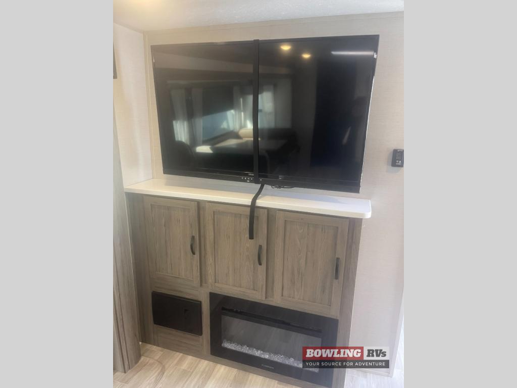 Whether you enjoy spending time outdoors or indoors, there is something for everyone in this travel trailer. The large pass-through storage can store your fishing poles, and the 20' electric awning with LED lights will create an outdoor living space. There is even an exterior baggage door with two exterior refrigerators, a TV, a spray port, and storage for snacks! You will love all the interior space thanks to the dual opposing slides in the main living area, which will give the chef space to work around the kitchen island. Your crew can visit on the tri-fold sofa, theater seating and booth dinette while the fireplace is going, but you'll probably find the kids spending most of their time in the private bunkhouse! They will have two bunks, Vibe cubes, a slide out for more space, plus a wardrobe to store all their clothes. What more could you want in a travel trailer?!