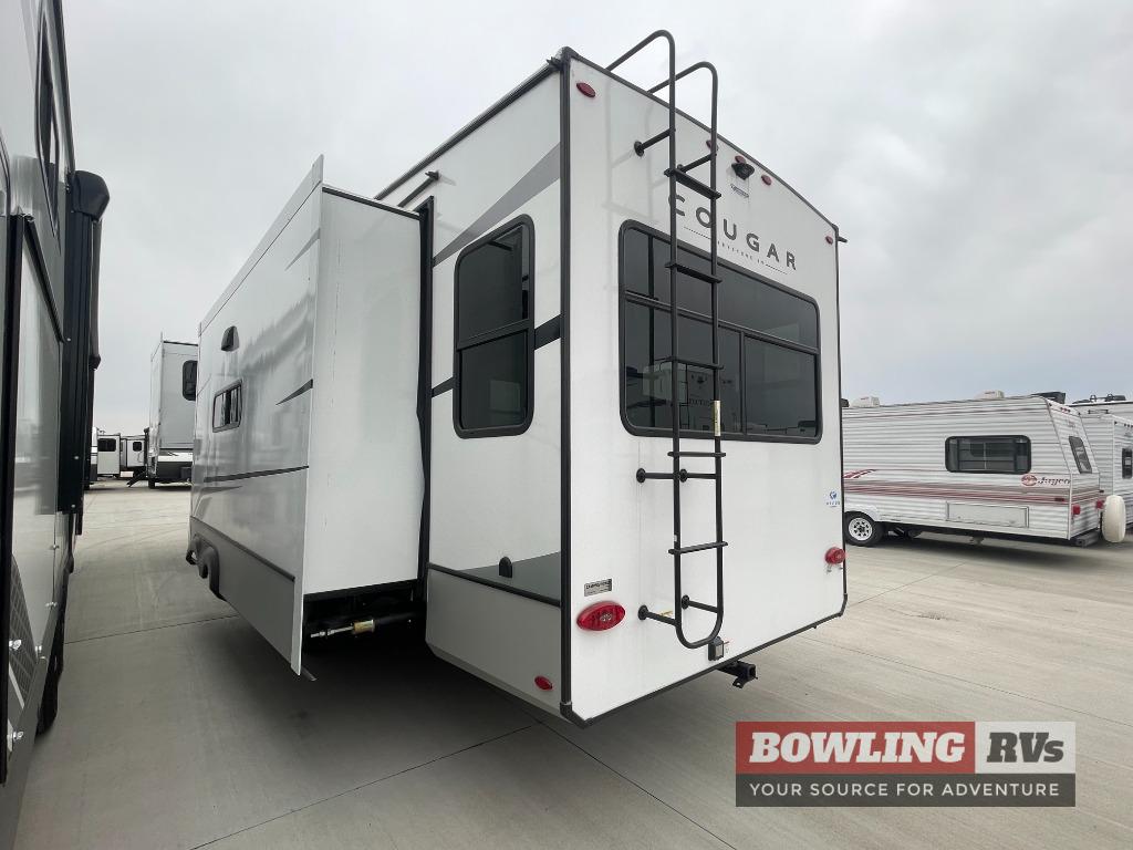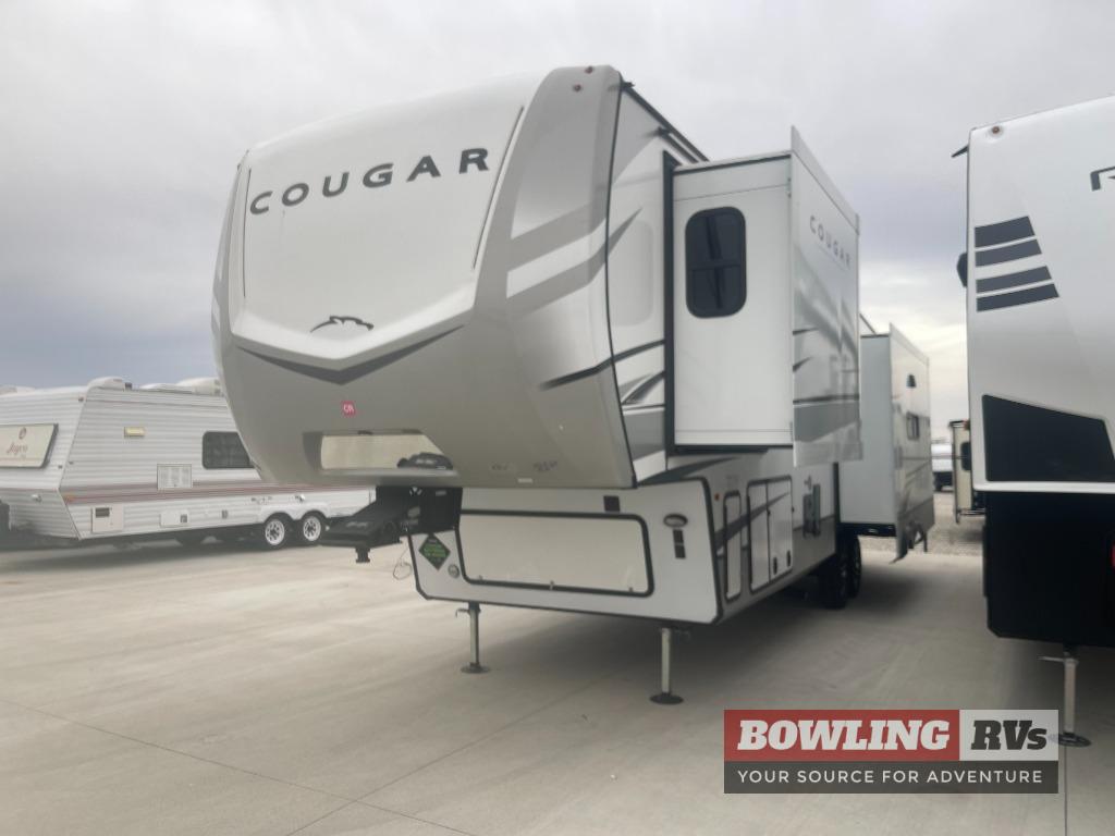 Spend more time having fun and less time worrying about your RV with the Keystone Cougar fifth wheel! These units have all that you will need for excellent vacations. The interior comes with 5/8" one-piece DynaSpan® flooring, tall slide outs for added comfort and head room, night roller shades throughout, and residential, raised-panel hardwood cabinet doors and drawers. You will also enjoy decorative crown molding, a 5,500 BTU electric fireplace with thermostat control and remote, and a Max Air exhaust fan with rain sensor. The exterior is also fully outfitted with a convenience center, friction-hinge entry door, electric four-point auto leveling system, and Lippert SolidStep® on the main entry. Each model is available with the optional Hero Edition. By choosing this edition, you can help support our nation's heros and their families by contributing to the Wounded Warrior Project. This optional package features an industry exclusive full-body paint matte finish, frameless windows, a glass entry door, blackout rims, and green LED exterior accent lighting; see dealer for more details!